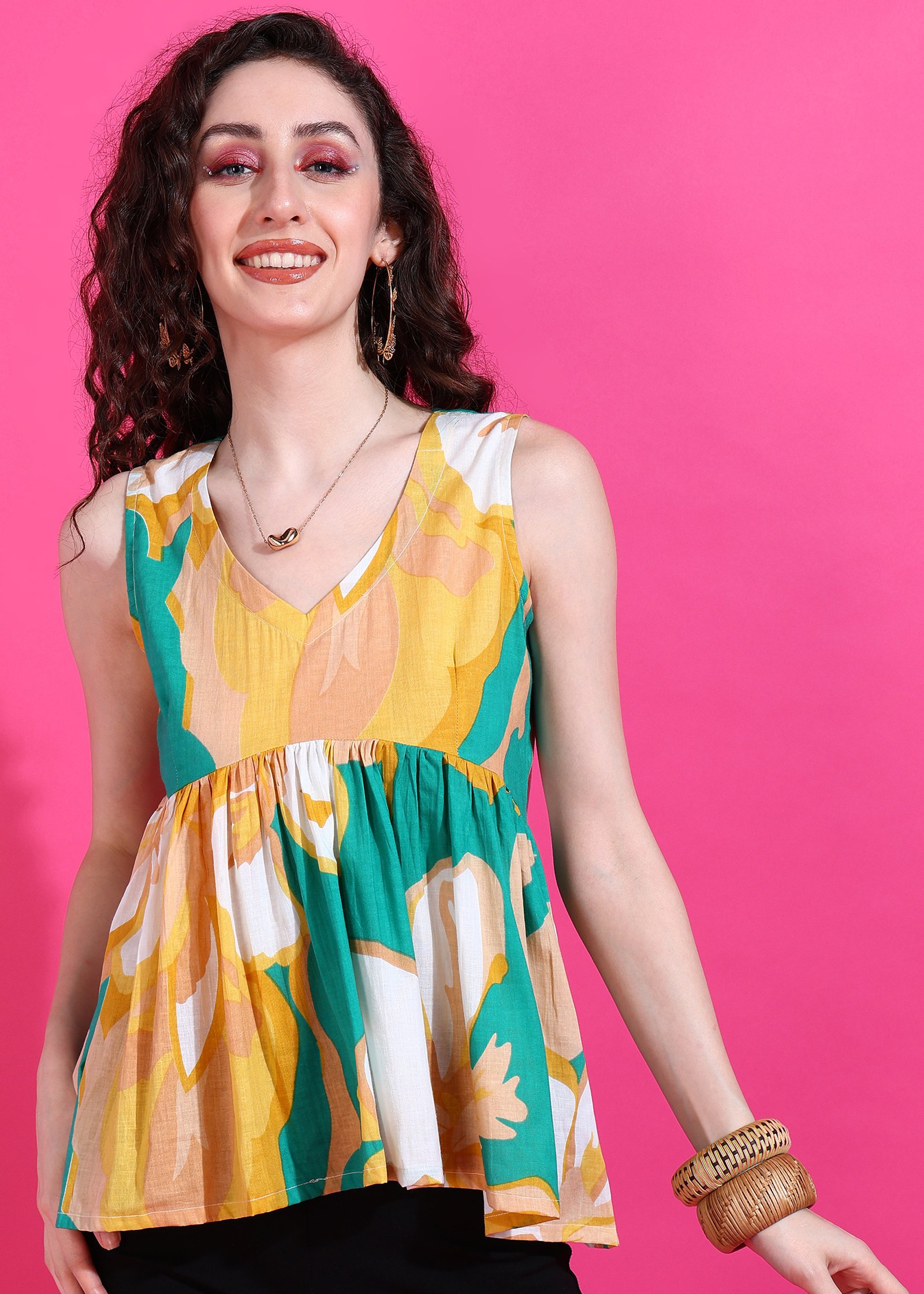 Embrace a cheerful and chic look with the Candy Bagh Peplum Top. This charming sleeveless top features a vibrant floral print in a delightful palette of teal, yellow, and white. The flattering V-neckline and a gracefully gathered peplum waist create an elegant and comfortable silhouette that highlights your figure. Perfect for adding a touch of playful sophistication to your everyday wear or a casual outing. Pair it with your favorite jeans, skirts, or tailored trousers.