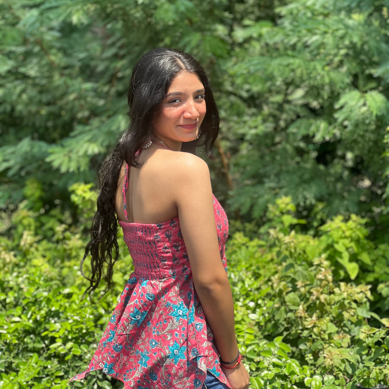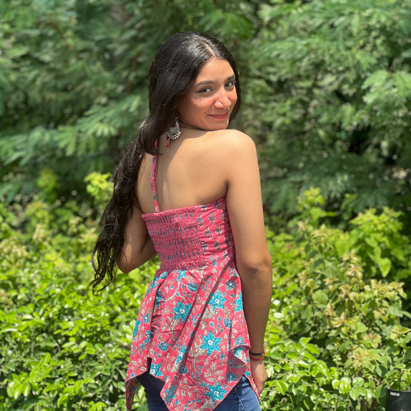 Turn heads wherever you go with Senyora’s ‘Gulabi Noor’ – a radiant asymmetric top that blends ethnic charm with modern cuts. Crafted from soft cotton fabric, this strappy piece flaunts a flattering asymmetric hem and floral print detailing that adds a playful flair. The beautiful fusion of gulabi (pink) tones with a contrasting turquoise base makes it a vibrant choice for casual days out, brunch dates, or college looks.