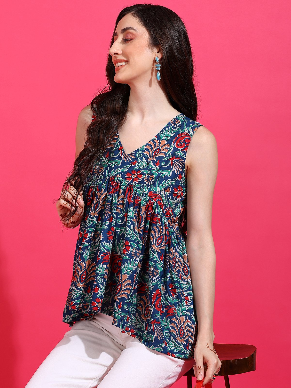 Embrace sophistication with the Senyora Navy Floral Print Gathered Peplum Top. This elegant sleeveless top features a deep navy base with a lush, multi-colored floral print. The flattering V-neck, cinched empire waist, and softly flared peplum hem create a defined and stylish silhouette. Perfect for blending ethnic prints with modern fashion, this navy floral peplum top is a chic choice for any casual or semi-formal event.