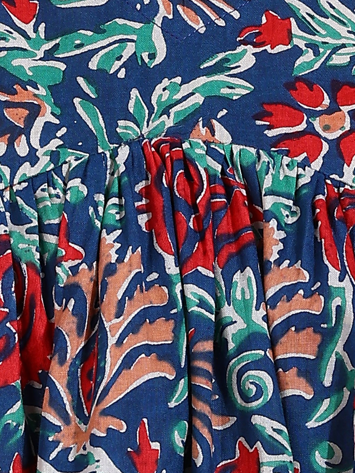 Rich Gulmohar Print: The top features a complex, intricate floral pattern on a deep navy blue background. The print showcases rich tones of red, green, and orange, giving it a luxurious, deep-hued aesthetic.