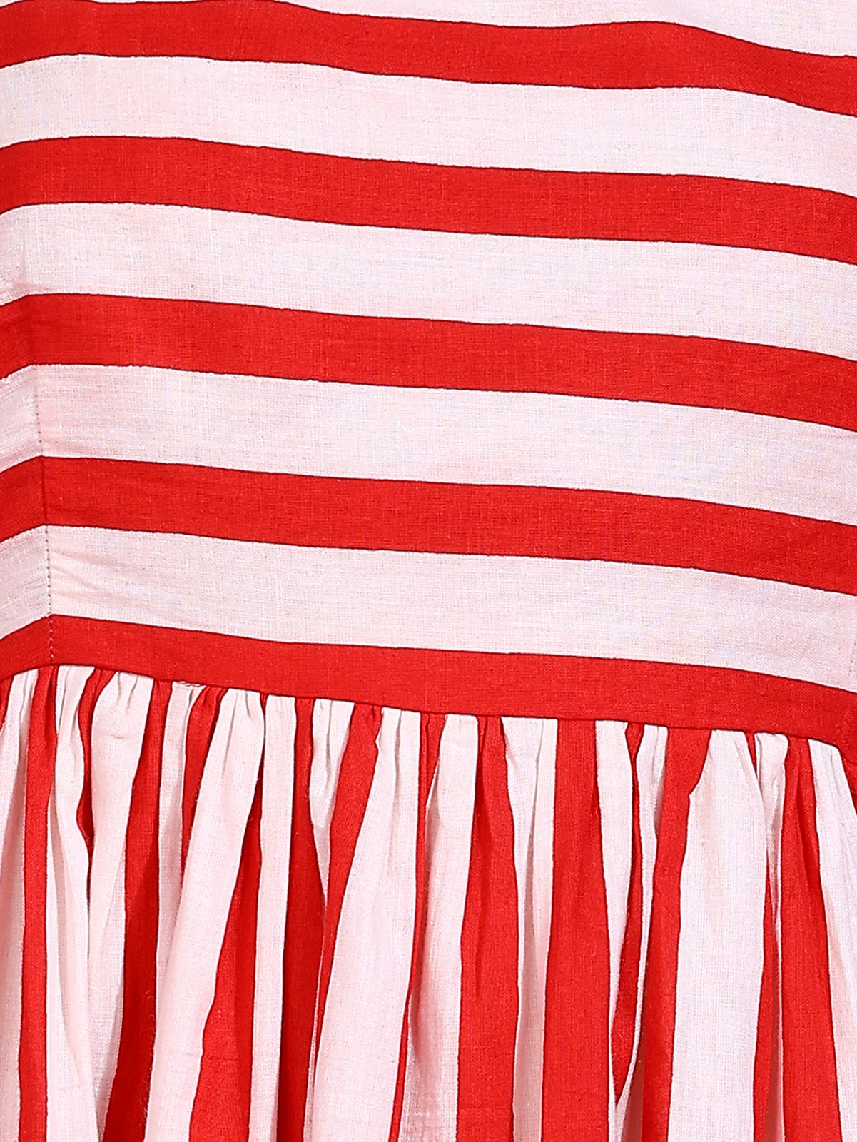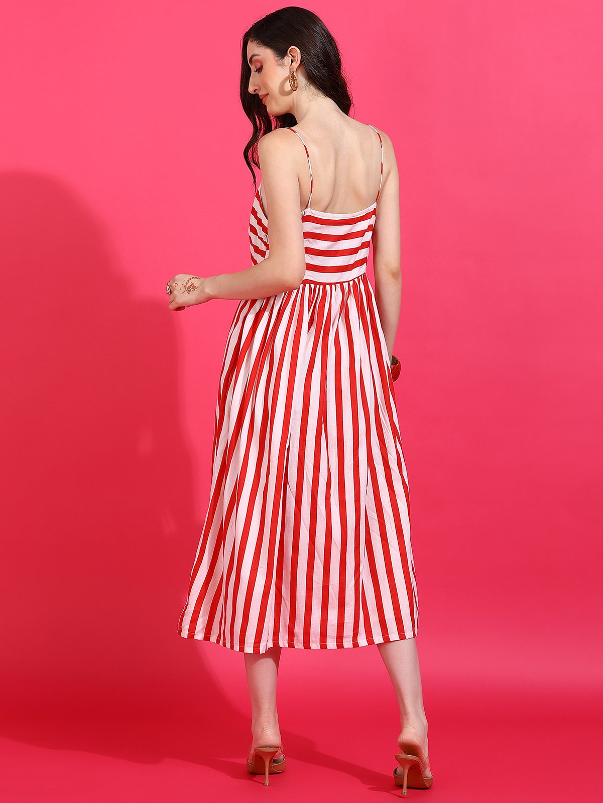 Make a bold statement with the Senyora Red & White Striped Strappy Midi Dress. This eye-catching summer sundress features a vibrant red and white vertical stripe pattern, a flattering fitted bodice with thin shoulder straps, and a full, flowing A-line skirt. Made from a comfortable, breathable cotton blend, this striped midi dress is perfect for resort wear, holiday parties, or a standout day-time look.