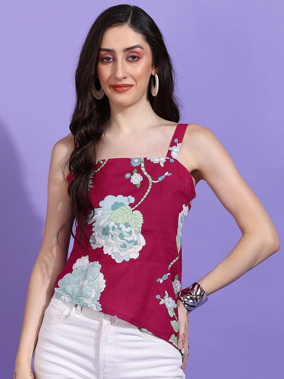 Shop the Senyora Rubira Magenta & Blue Floral Print Strappy Asymmetric Top and elevate your style with dramatic color!