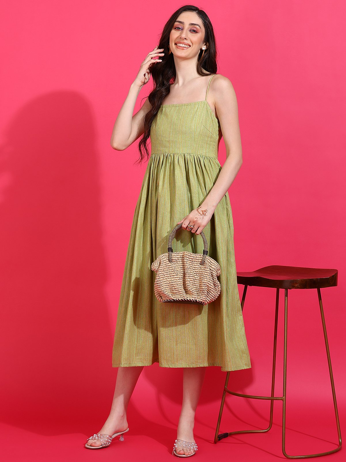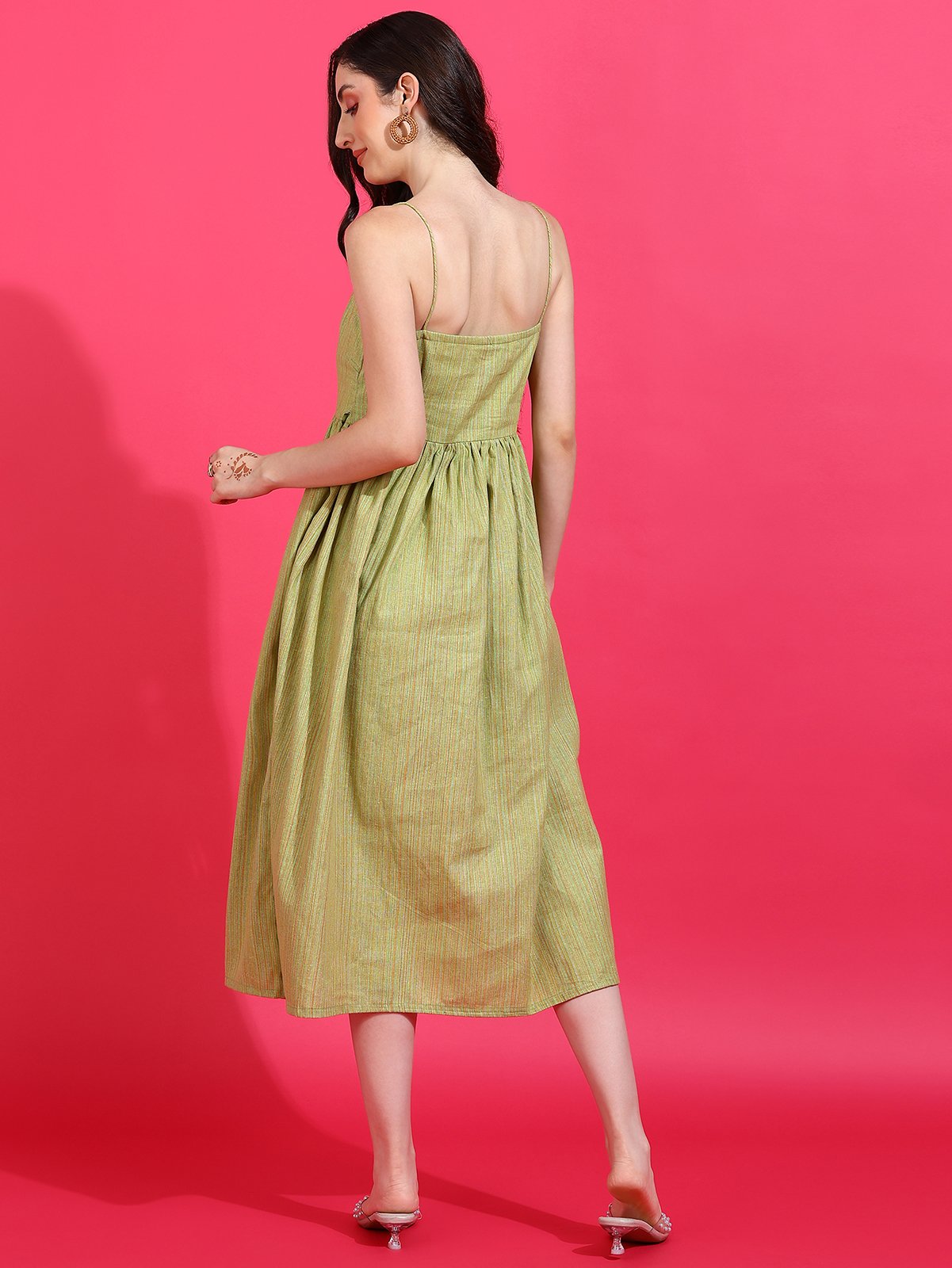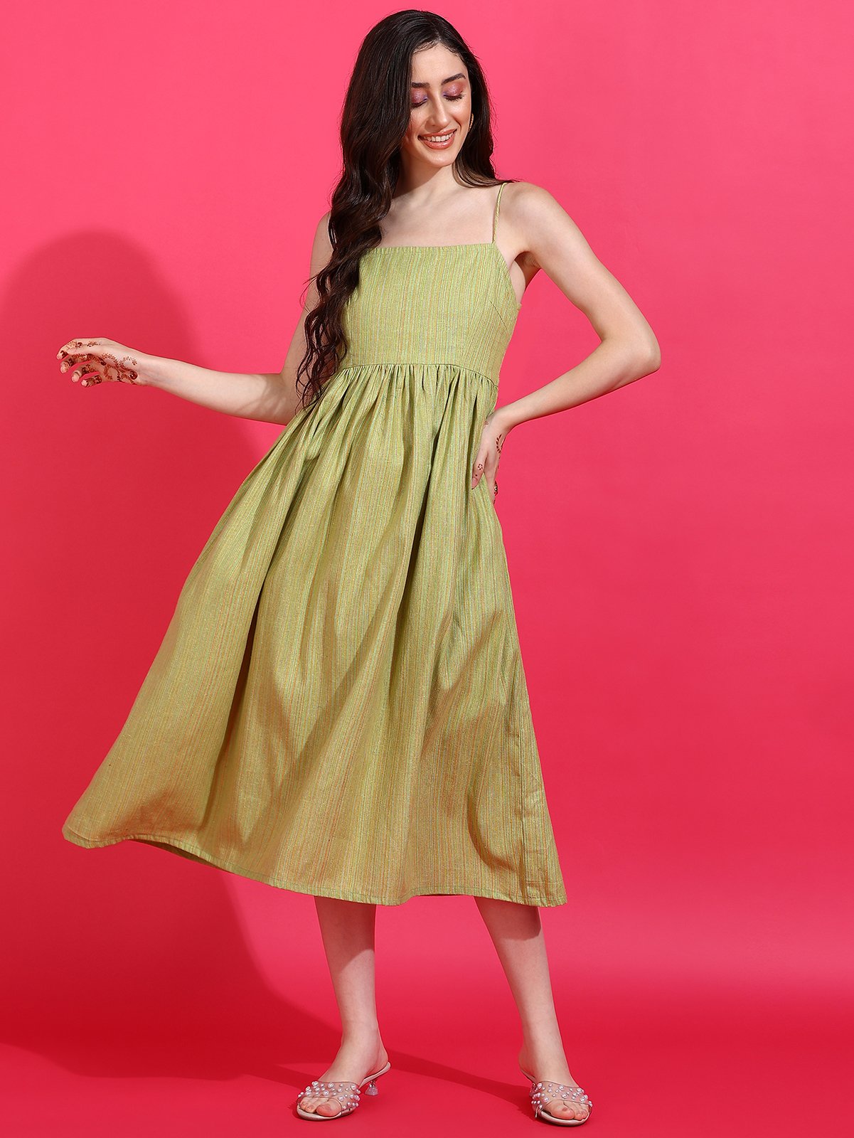 Shop the Senyora Taza Pista Green Striped Strappy Midi Dress and add graceful freshness to your collection!