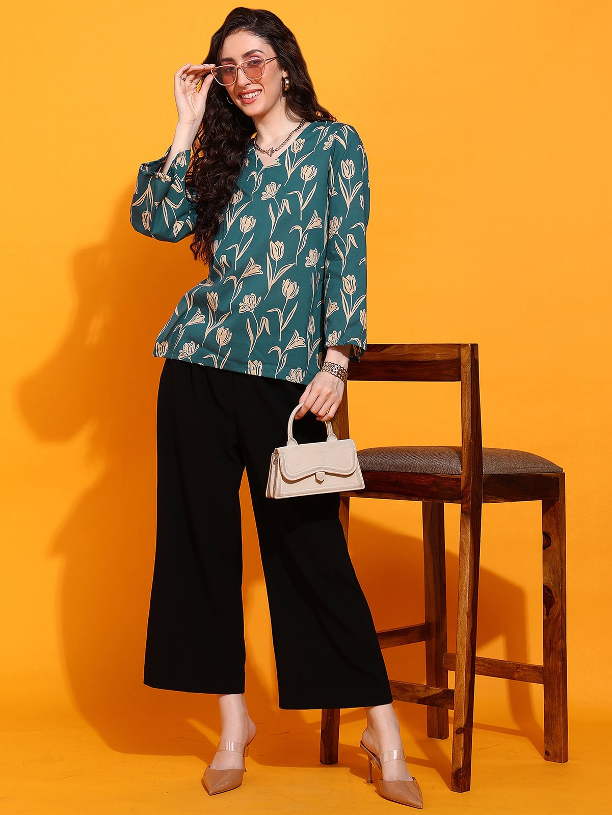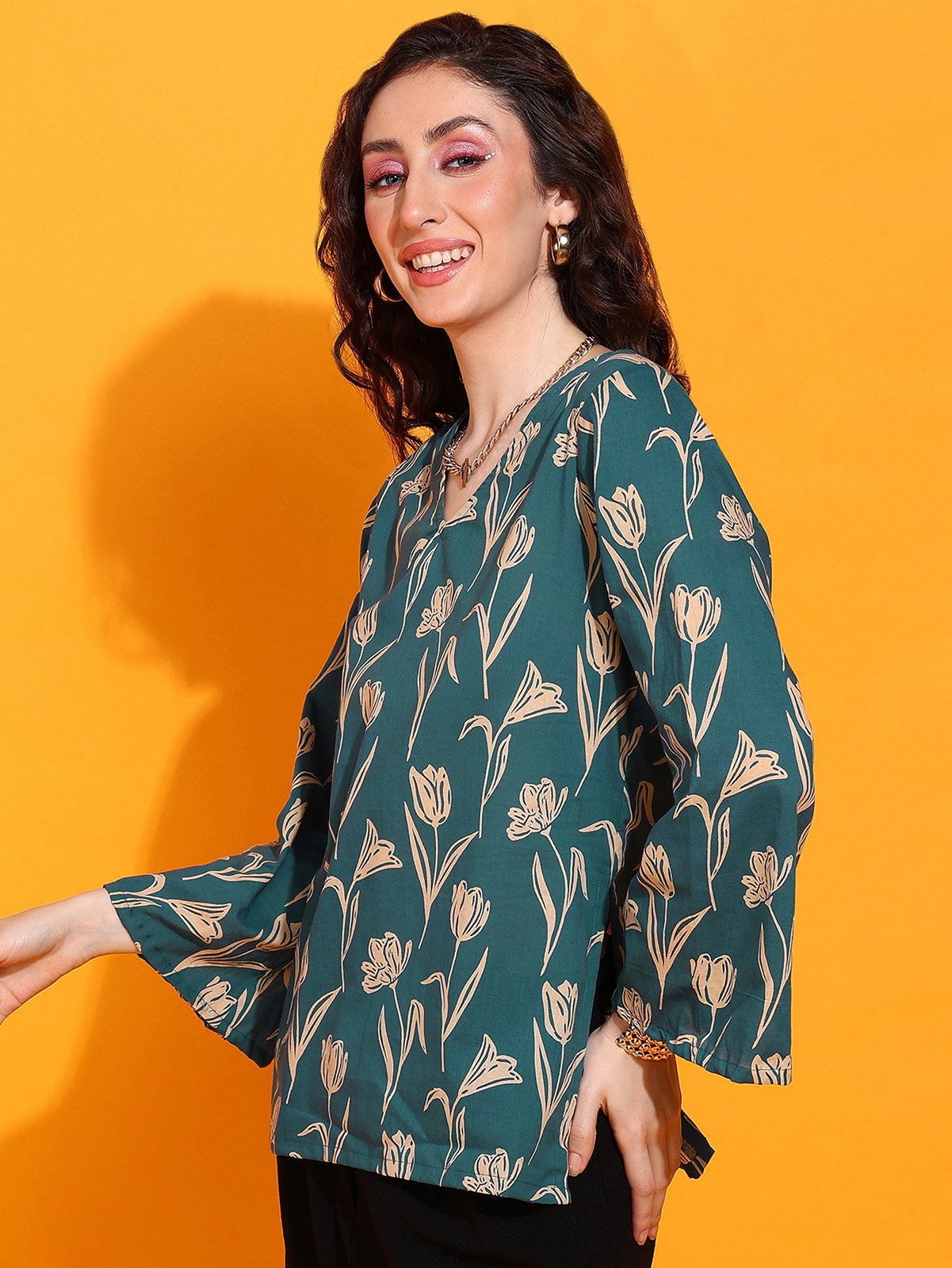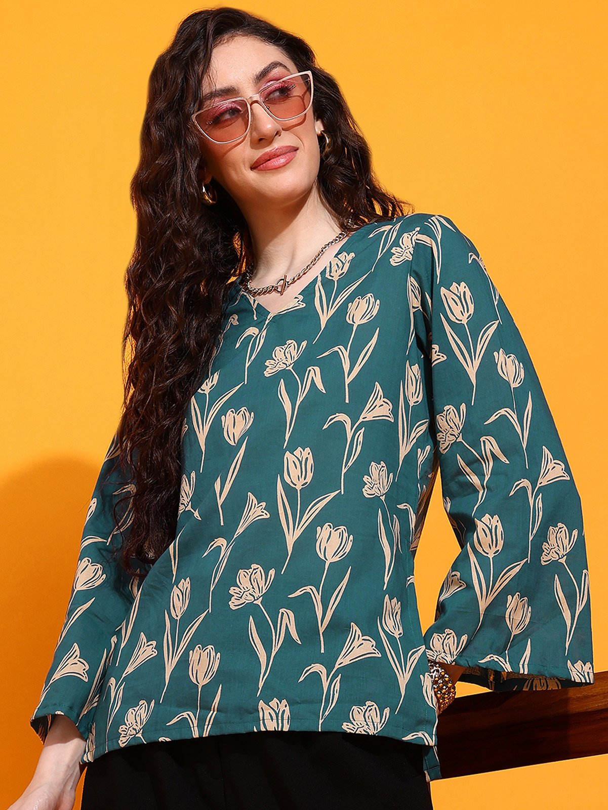 A chic floral Bell Sleev top designed for Gen Z girls who love comfort, charm, and a little chaos. Made for your college, café, or casual workdays — all in one fit.