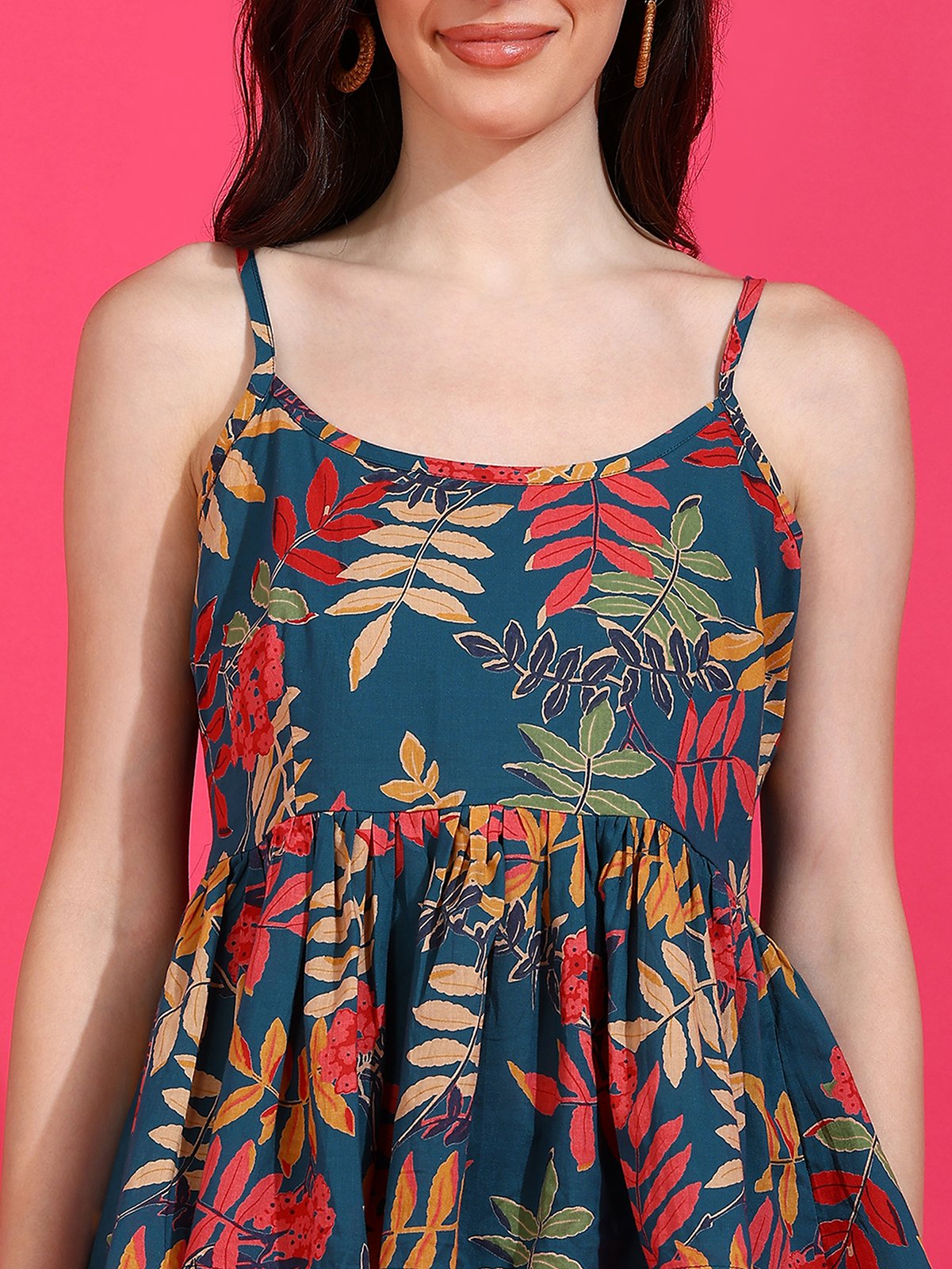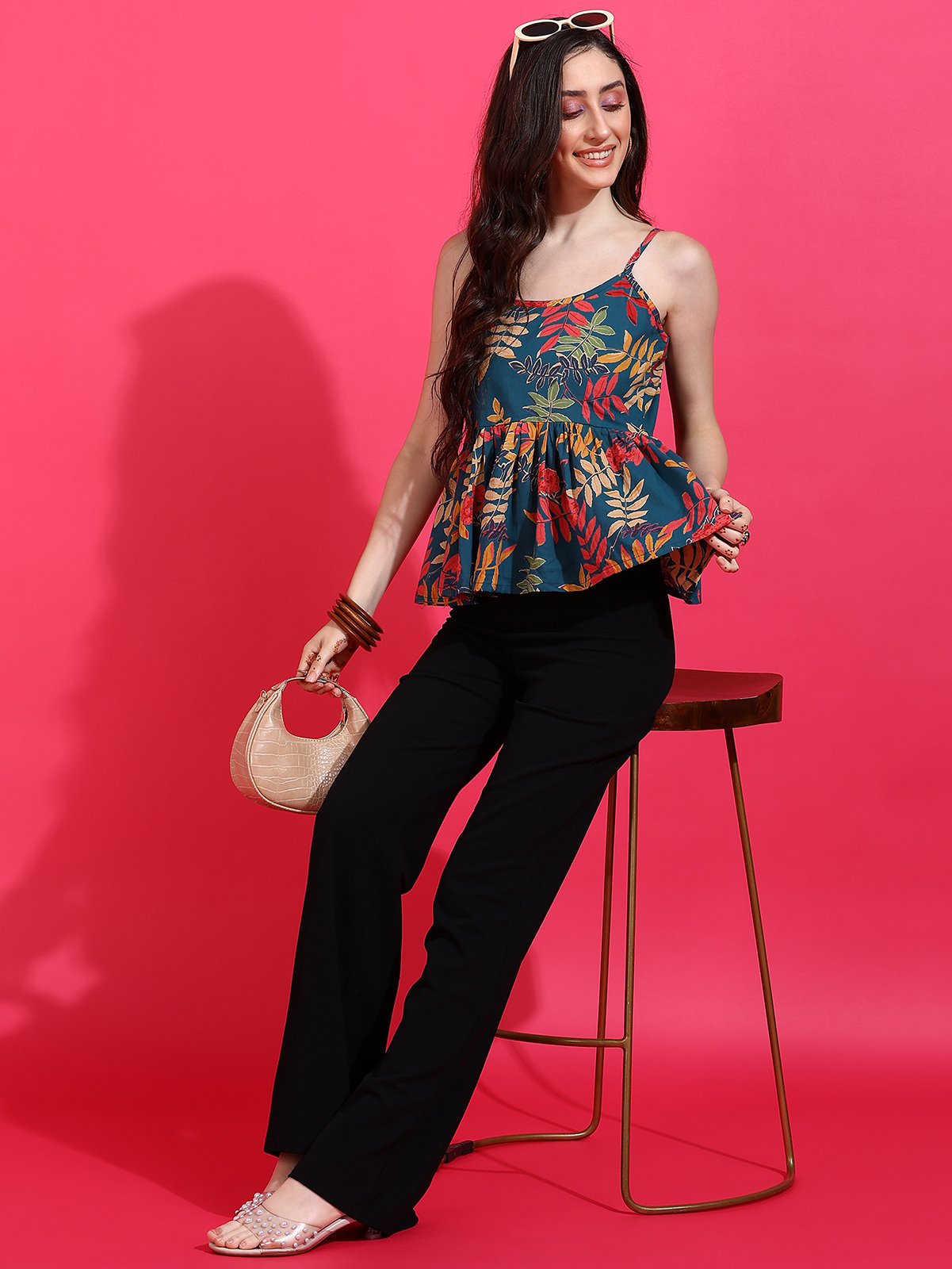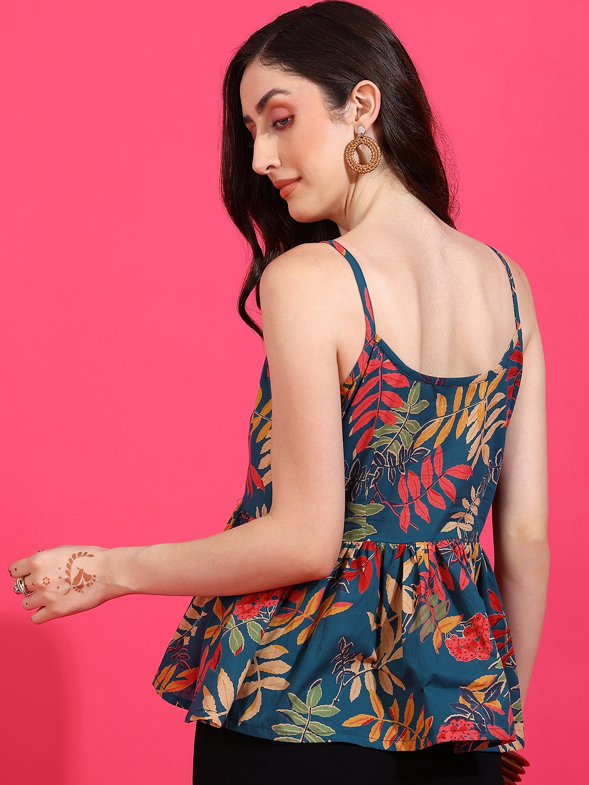 Step into the beauty of the forest with the Senyora Vanmohini Teal Multi-Color Leaf Print Gathered Peplum Top. This charming sleeveless top features a vibrant print of teal, red, orange, and green leaves on a deep teal base. The simple, elegant strappy neckline, cinched waist, and flowing gathered peplum hem create a flattering, feminine silhouette. Perfect for a resort holiday, brunch, or any stylish outing.