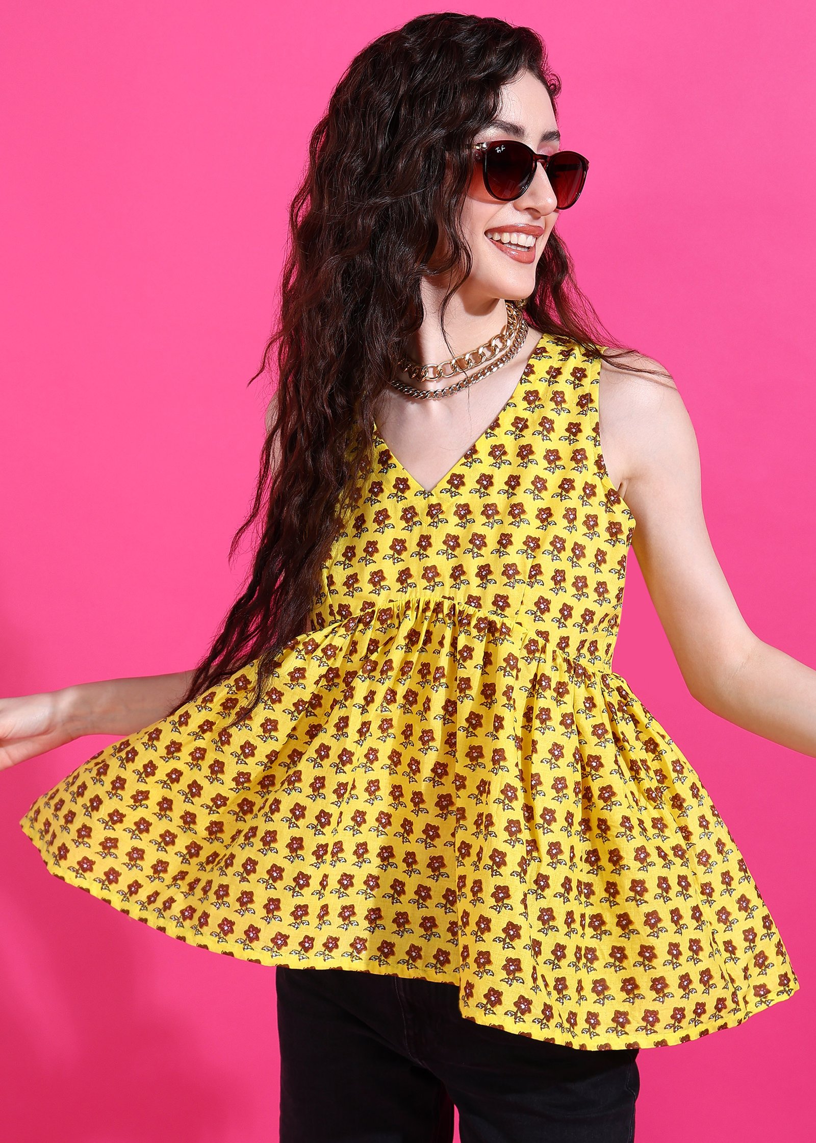 Add a feminine flair to your look with the Senyora Yellow Floral Print V-Neck Peplum Top. This charming sleeveless top features a vibrant yellow base with a delicate red-brown Genda Gul (Marigold) floral print. The flattering V-neckline and gracefully gathered peplum hem create a defined and stylish silhouette. Perfect for brightening up your casual, work, or festive wardrobe, this yellow floral peplum top pairs beautifully with high-waisted bottoms.