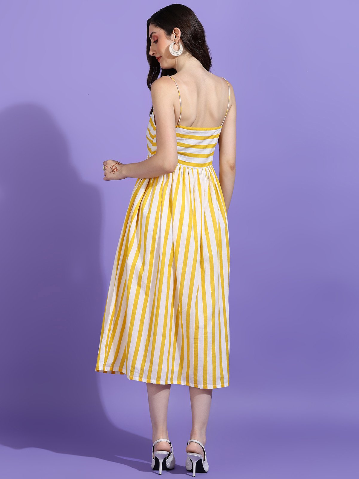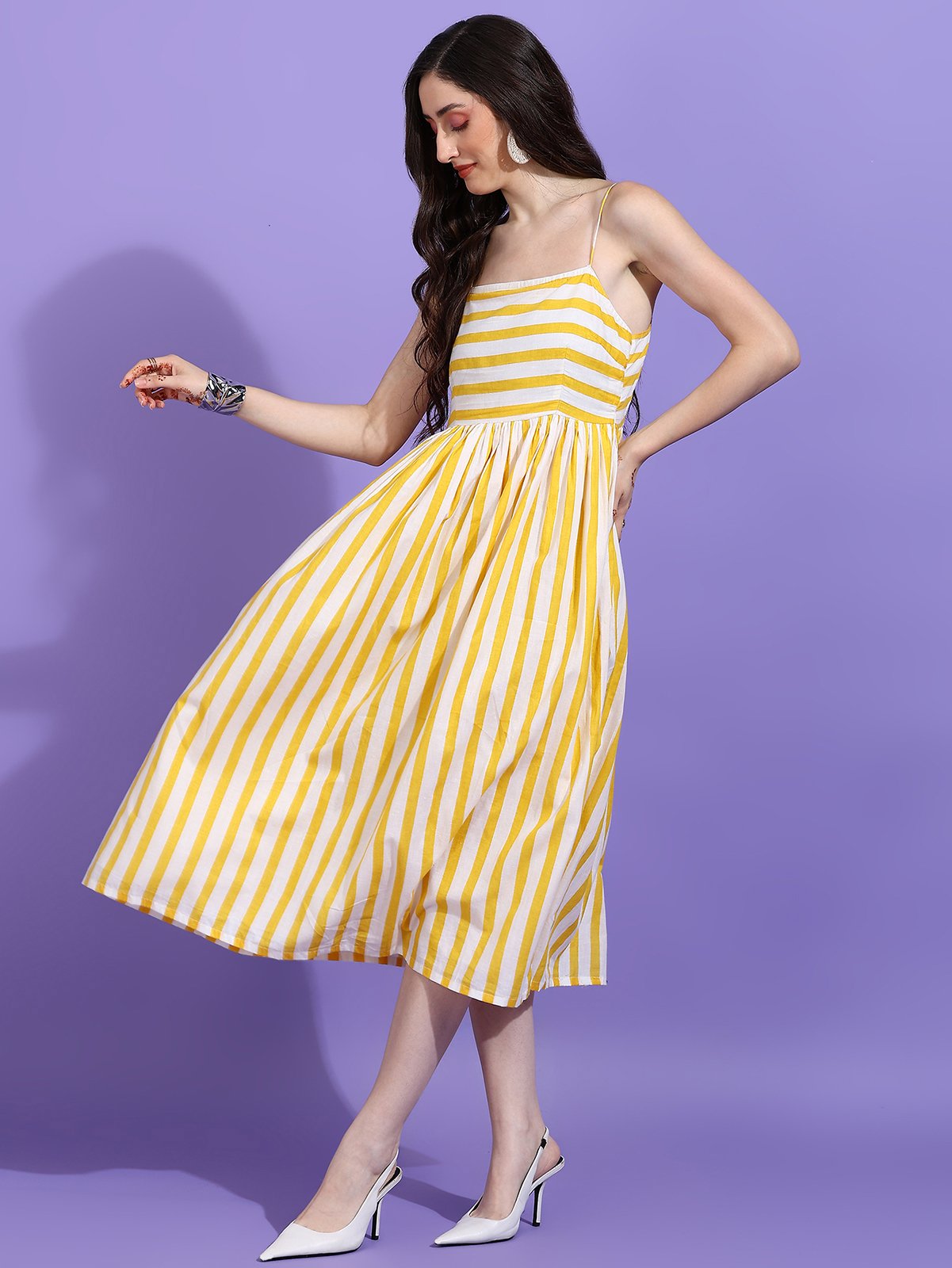 Step into the sunshine with the Senyora Yellow & White Striped Strappy Midi Dress. This breezy summer sundress features a vibrant yellow and white vertical stripe pattern, a flattering fitted bodice with thin shoulder straps, and a full, flowing skirt. Made from a comfortable cotton blend, this striped midi dress is perfect for brunches, vacations, or a stylish day out. Available in sizes XS to XXL.