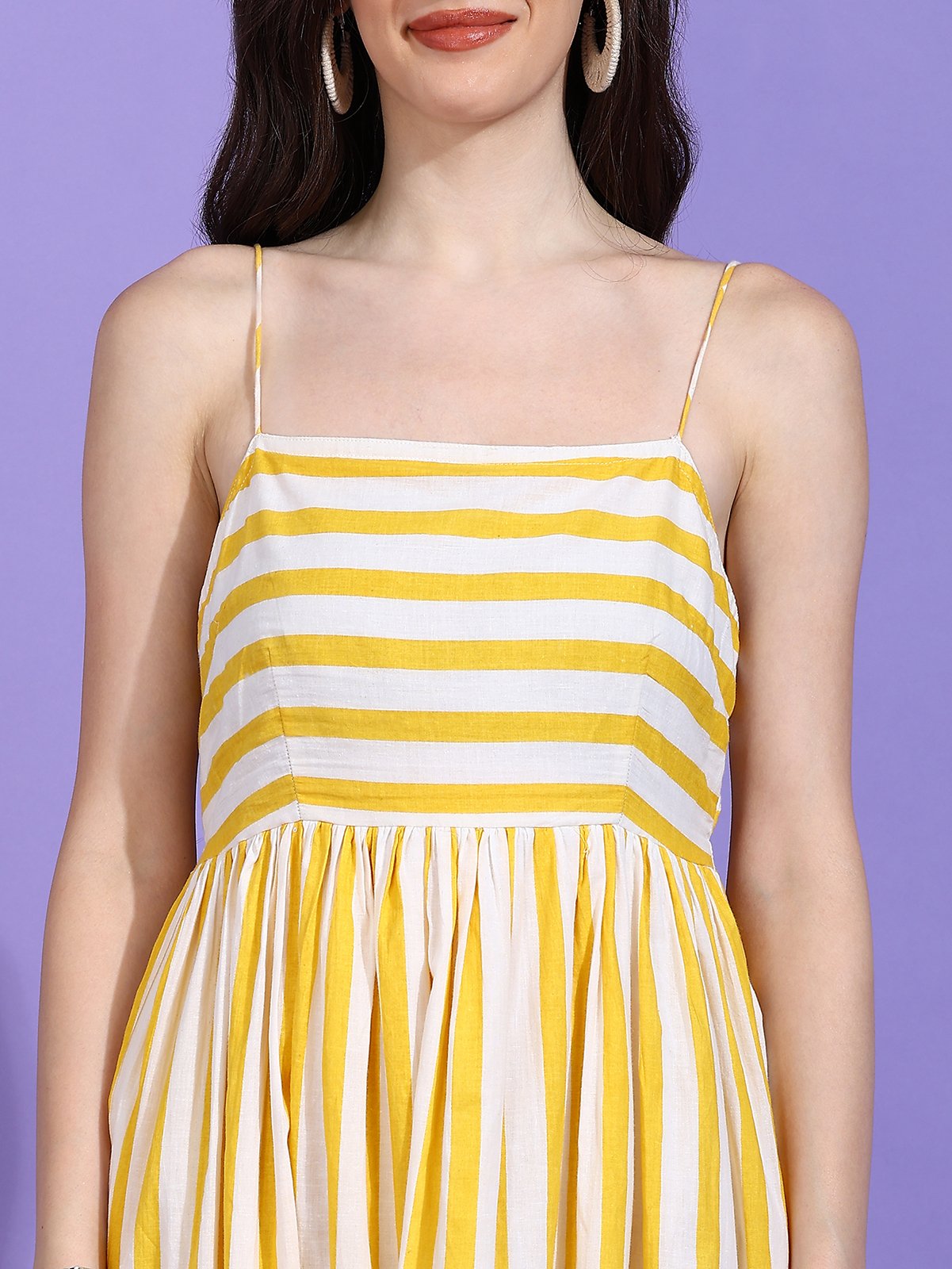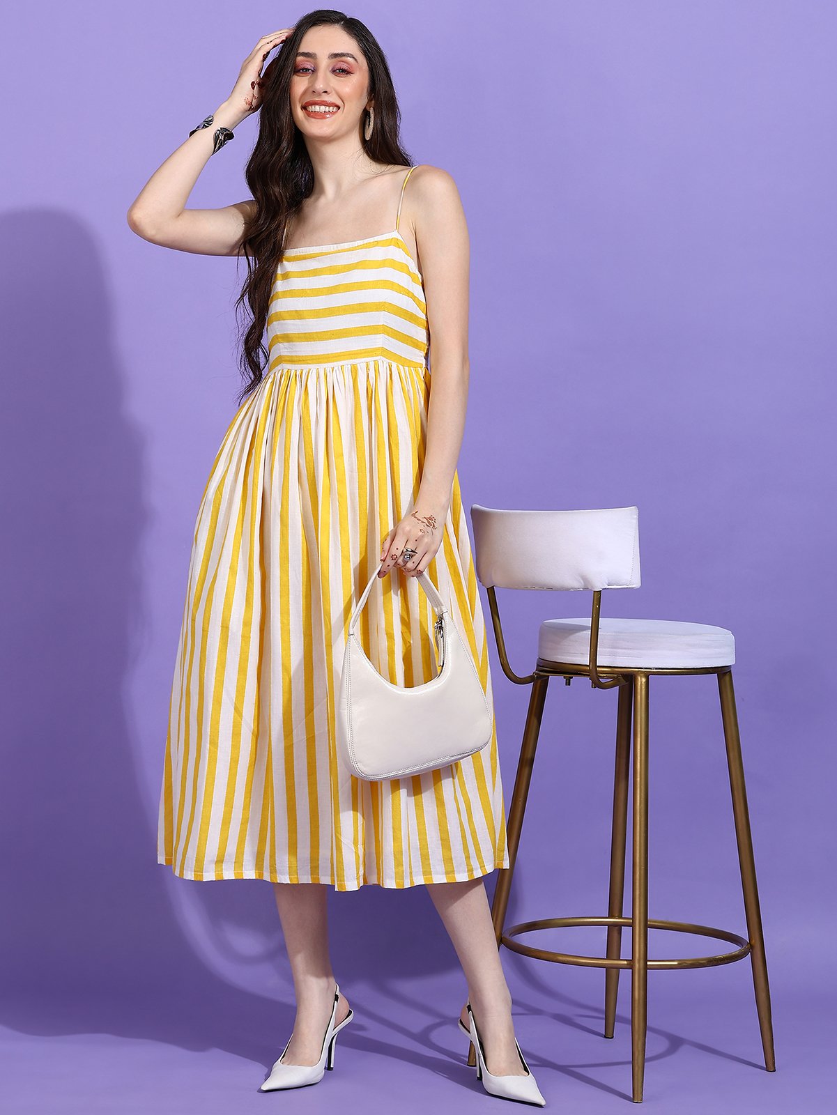 Vibrant Stripe Pattern: The dress features a playful yet sophisticated yellow and white striped pattern. The vertical stripes on the skirt visually elongate your silhouette, creating a graceful and flattering look.