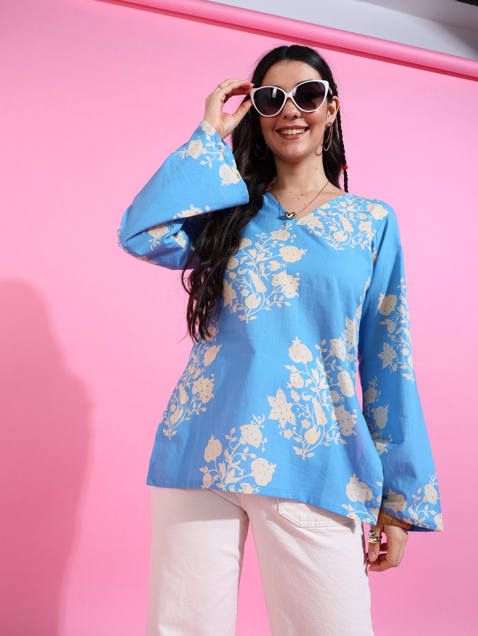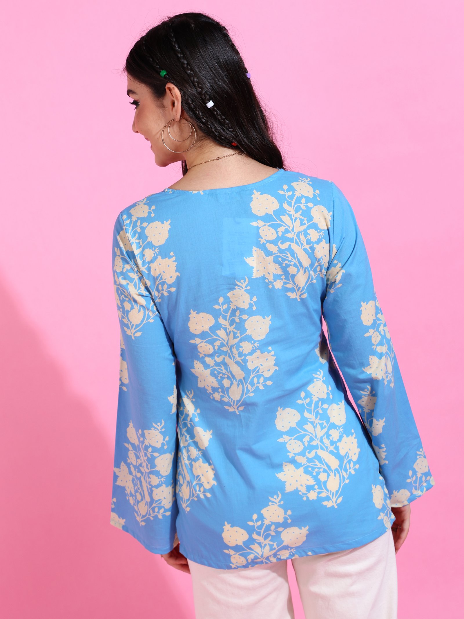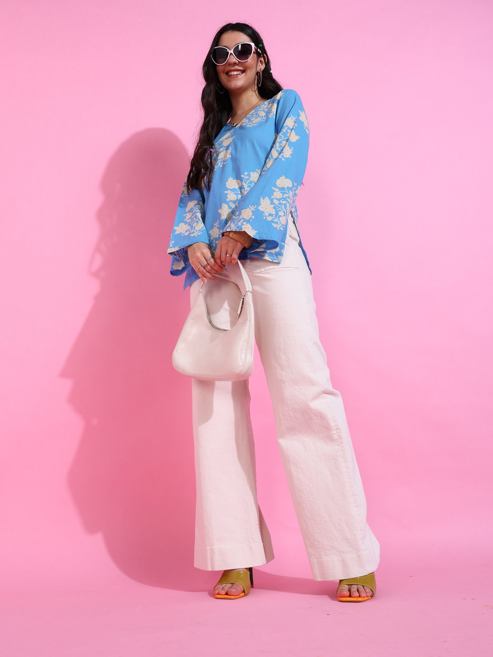Elegant and refreshing, our Blueberry Bell Sleeve Kurti is crafted in a soothing blue shade with delicate floral patterns. Designed with graceful bell sleeves and a flattering V-neckline, it’s perfect for casual outings, festive gatherings, or everyday chic styling.