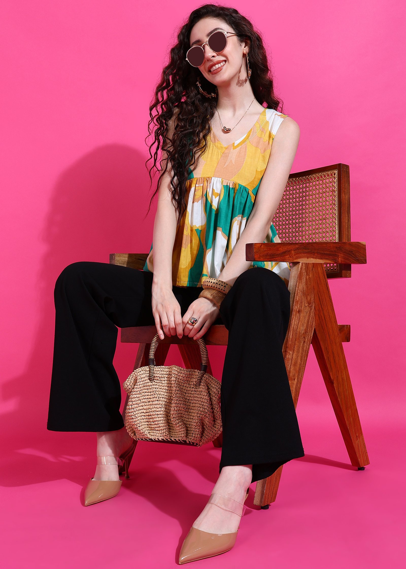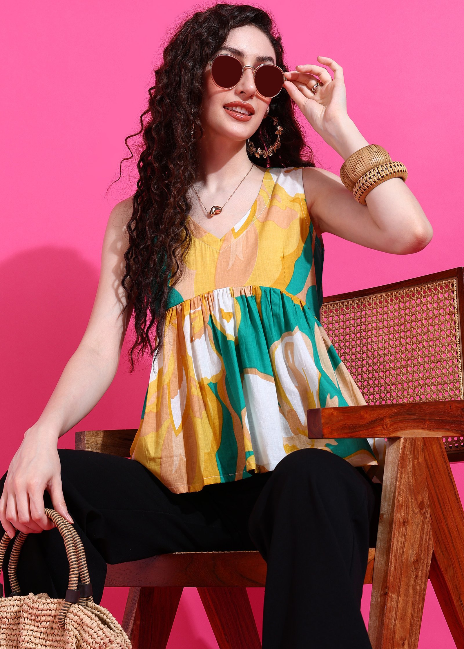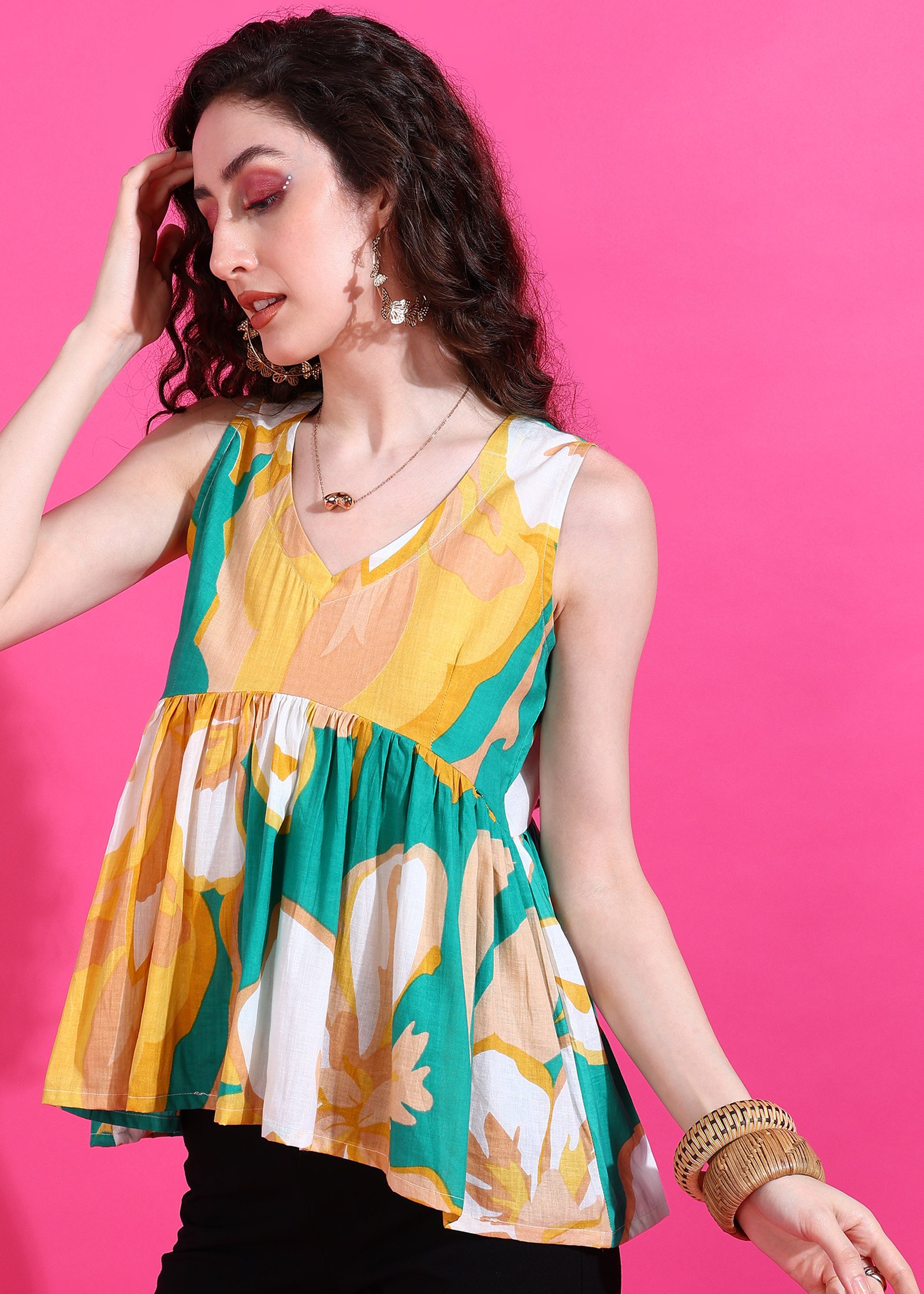 Embrace a cheerful and chic look with the Candy Bagh Peplum Top. This charming sleeveless top features a vibrant floral print in a delightful palette of teal, yellow, and white. The flattering V-neckline and a gracefully gathered peplum waist create an elegant and comfortable silhouette that highlights your figure. Perfect for adding a touch of playful sophistication to your everyday wear or a casual outing. Pair it with your favorite jeans, skirts, or tailored trousers.