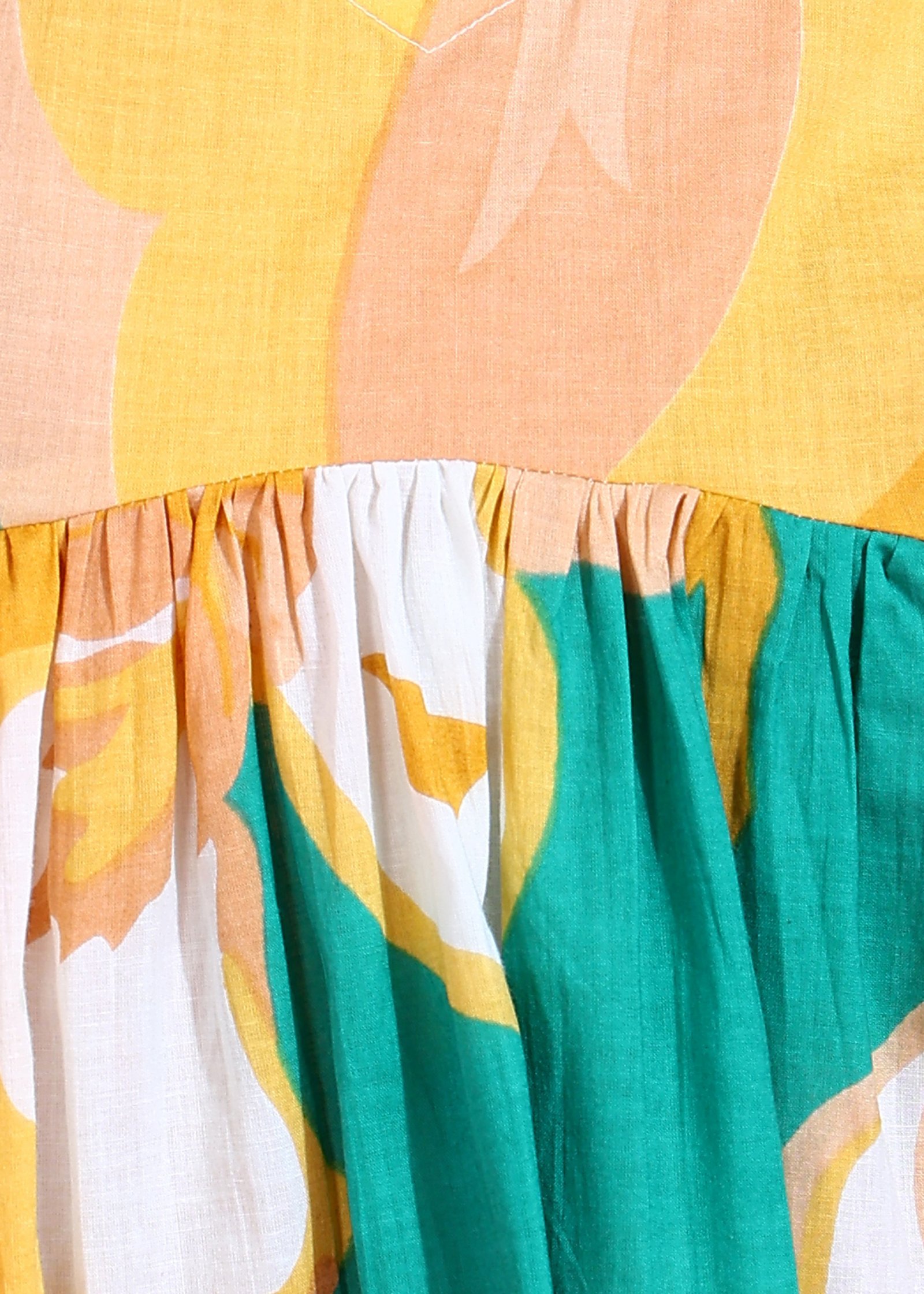 Introducing the Candy Bagh Peplum Top, a delightful addition that brings both vibrancy and comfort to your collection. This sleeveless top is designed to brighten your day with its enchanting floral pattern, showcasing a harmonious blend of rich teal green, sunny yellow, and crisp white. The unique 'Bagh' (garden) inspired print adds an artistic and fresh feel to the garment.