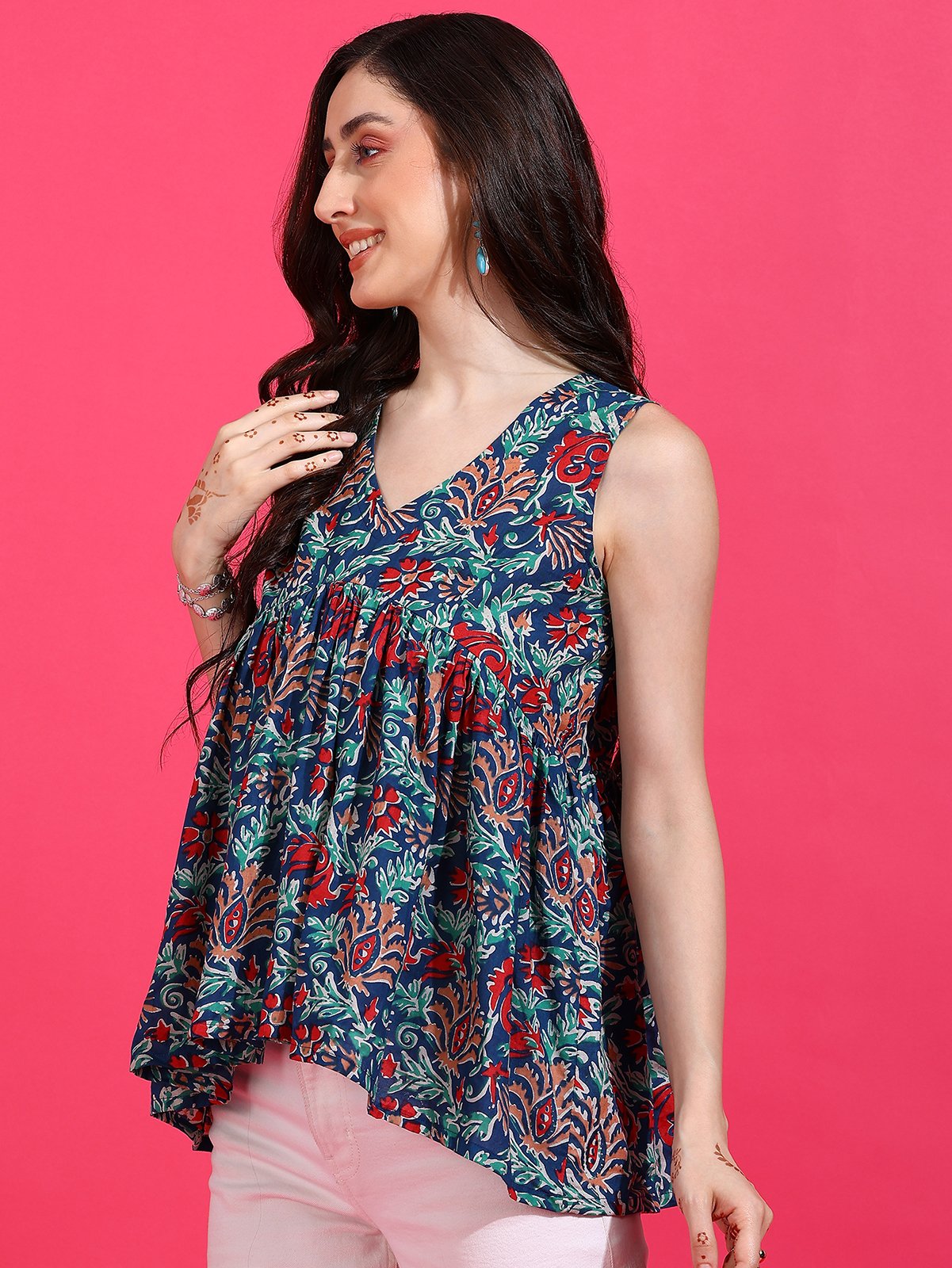 Embrace sophistication with the Senyora Navy Floral Print Gathered Peplum Top. This elegant sleeveless top features a deep navy base with a lush, multi-colored floral print. The flattering V-neck, cinched empire waist, and softly flared peplum hem create a defined and stylish silhouette. Perfect for blending ethnic prints with modern fashion, this navy floral peplum top is a chic choice for any casual or semi-formal event.