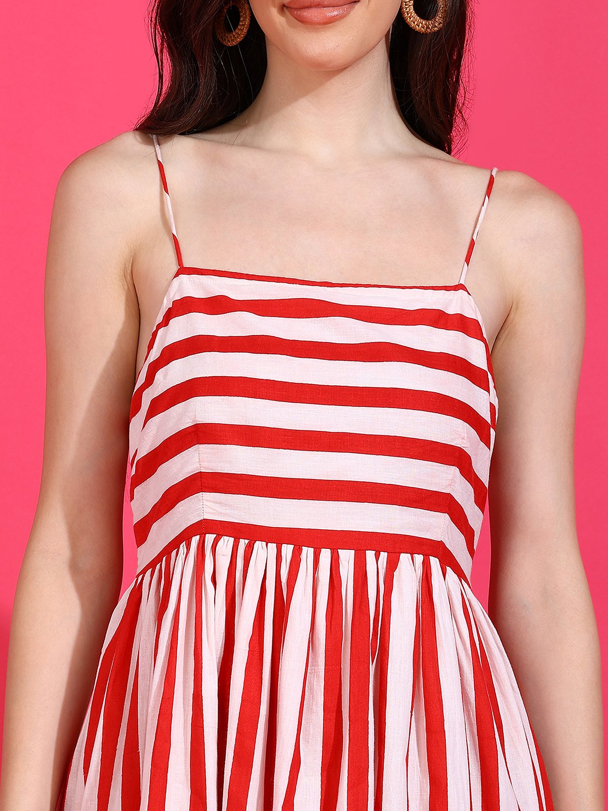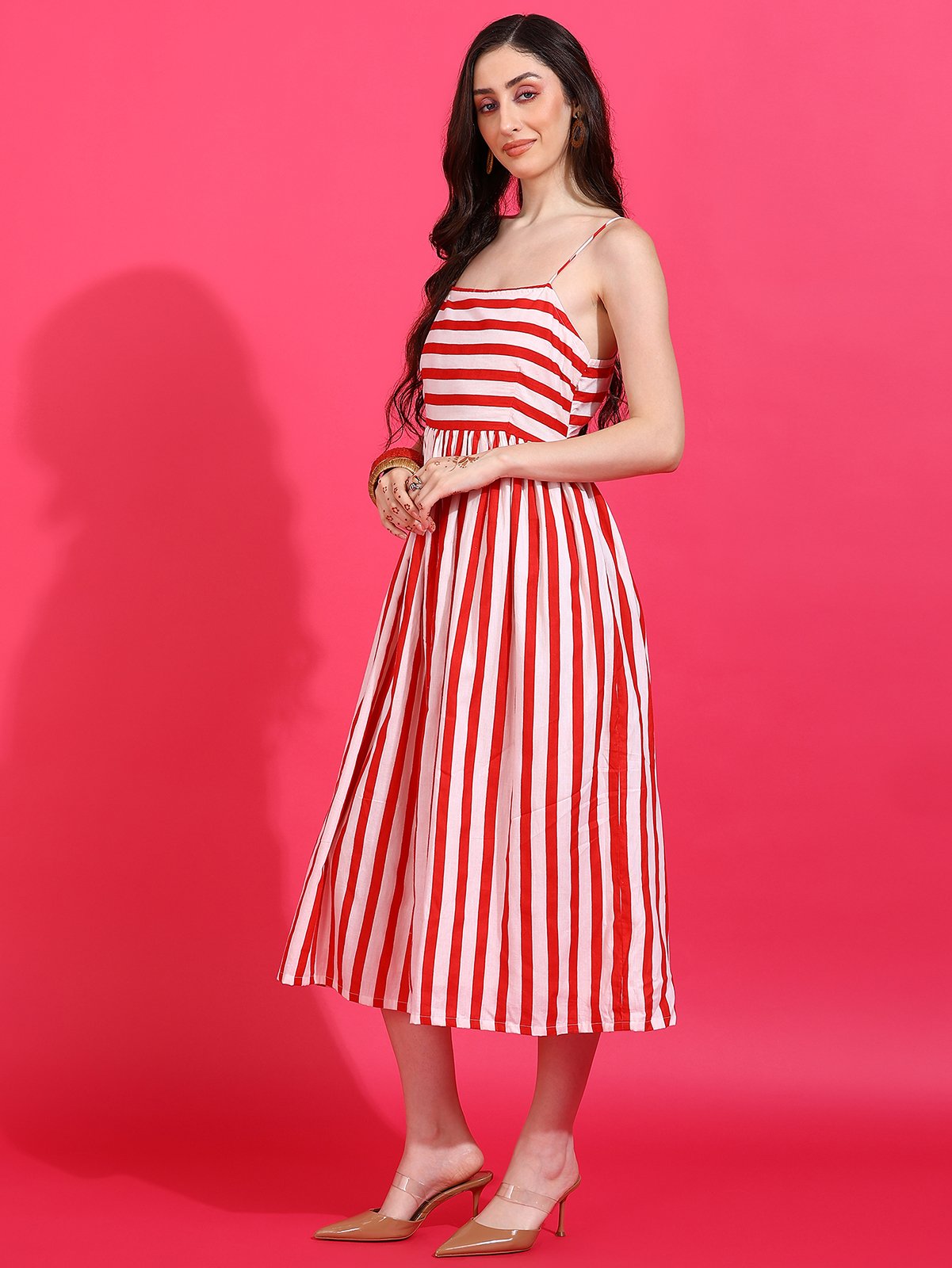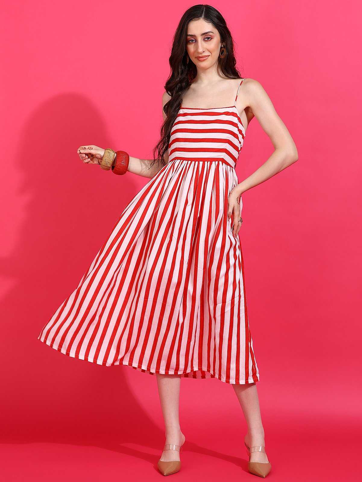 Make a bold statement with the Senyora Red & White Striped Strappy Midi Dress. This eye-catching summer sundress features a vibrant red and white vertical stripe pattern, a flattering fitted bodice with thin shoulder straps, and a full, flowing A-line skirt. Made from a comfortable, breathable cotton blend, this striped midi dress is perfect for resort wear, holiday parties, or a standout day-time look.