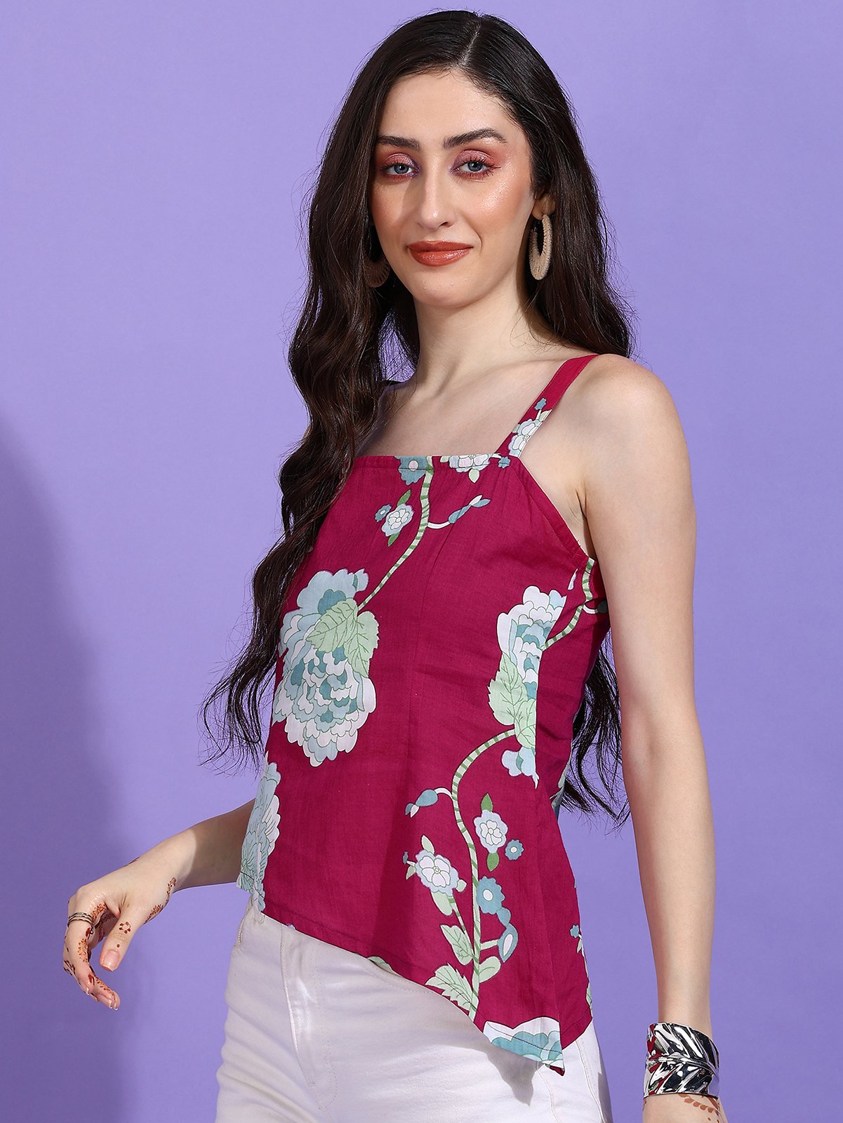 Shop the Senyora Rubira Magenta & Blue Floral Print Strappy Asymmetric Top and elevate your style with dramatic color!