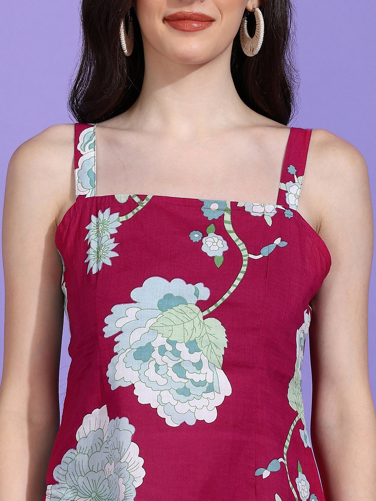 Make a bold style statement with the Senyora Rubira Magenta & Blue Floral Print Strappy Asymmetric Top. This high-fashion sleeveless top features a rich magenta base adorned with a dramatic blue and white floral print. The delicate shoulder straps and trendy asymmetric hemline give it a unique, flattering shape. Perfect for summer parties, resort wear, or a chic night out, this magenta strappy top is an instant wardrobe upgrade.
