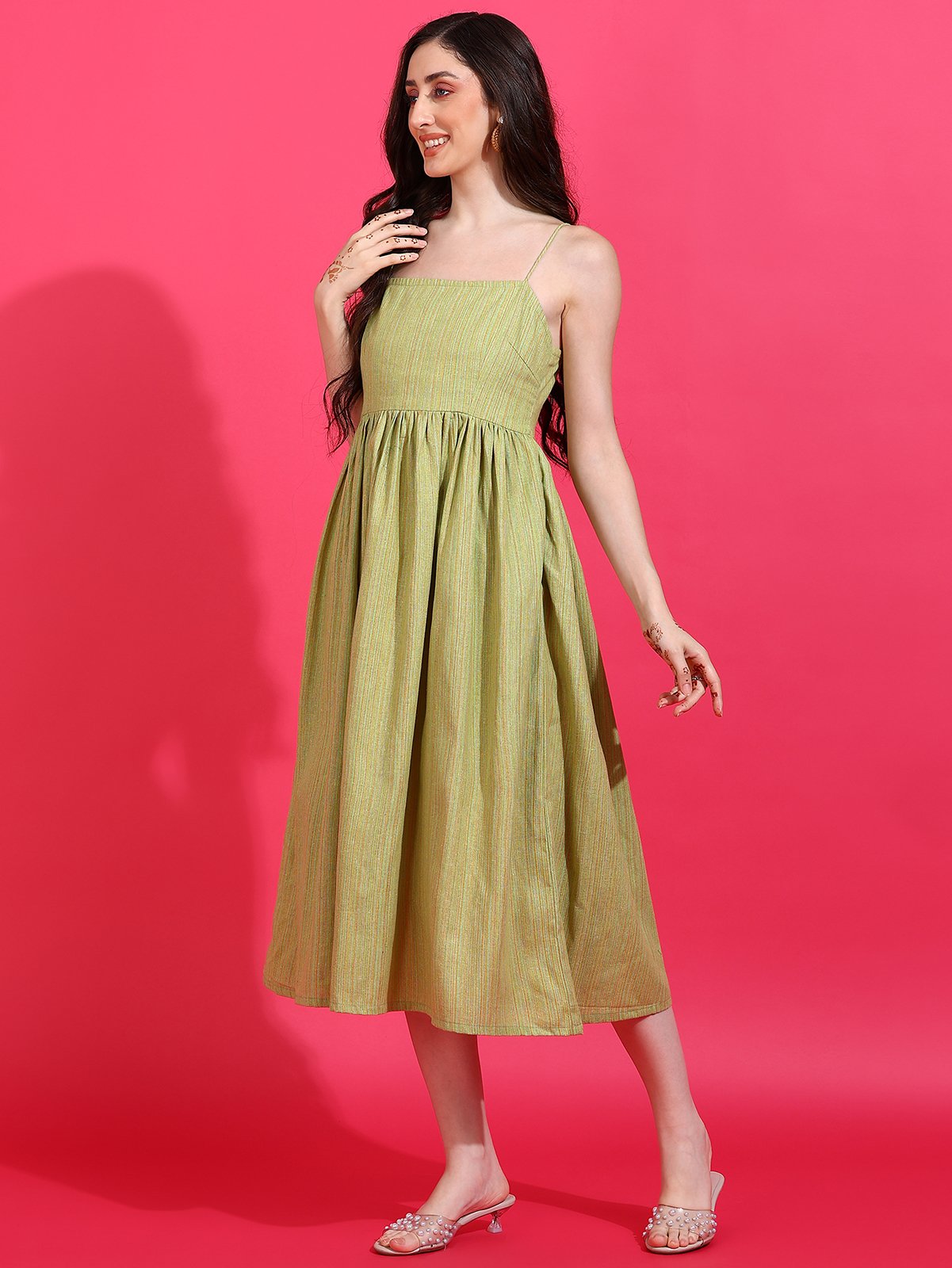 Shop the Senyora Taza Pista Green Striped Strappy Midi Dress and add graceful freshness to your collection!