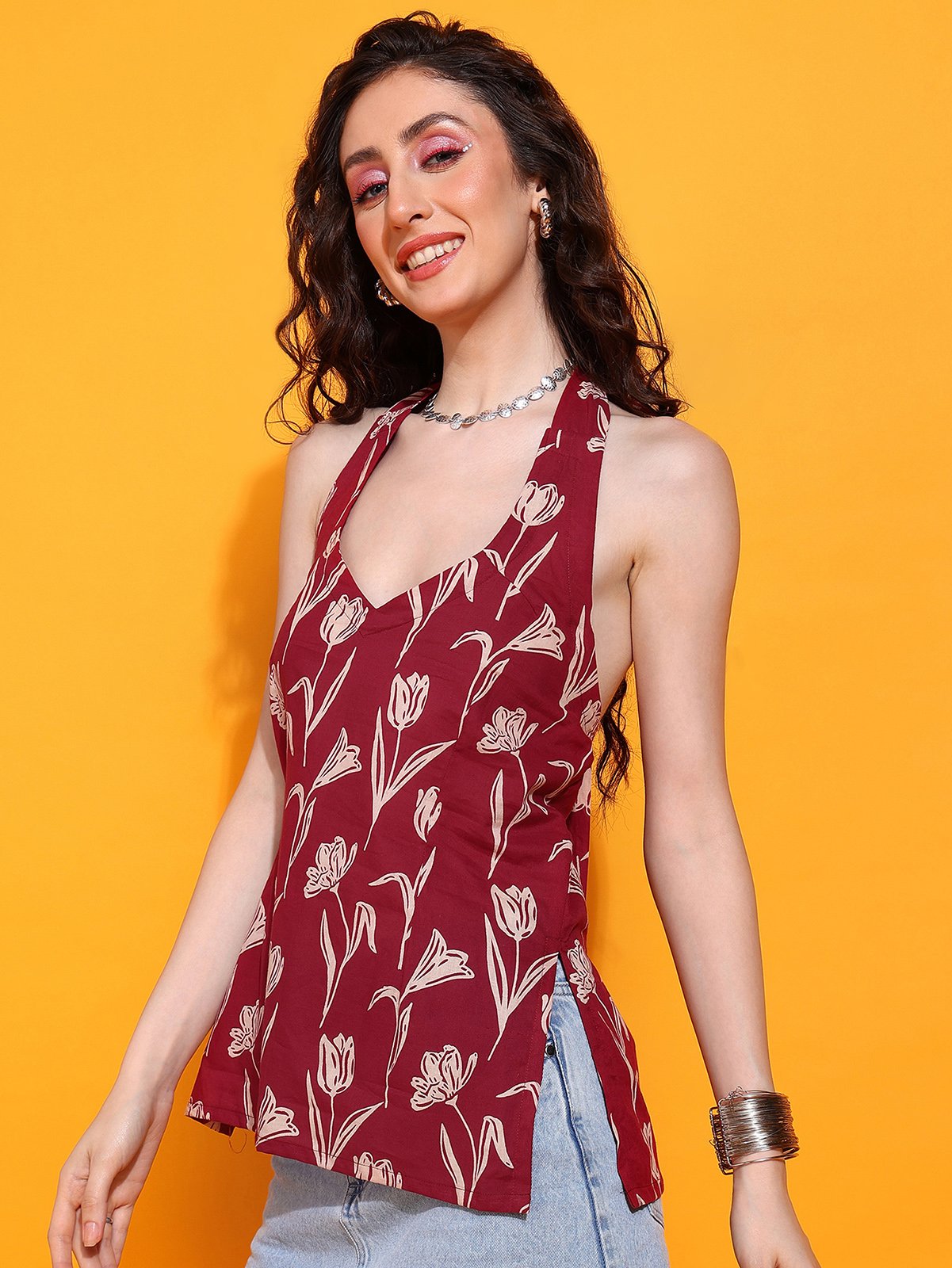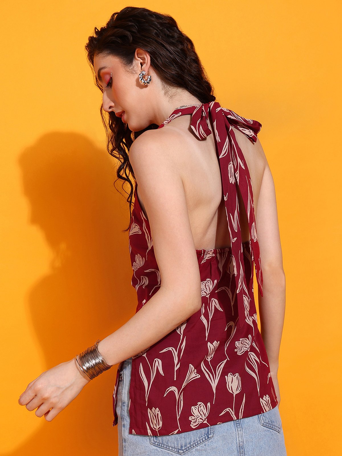 Bring a touch of blooming elegance to your wardrobe with the Tulip Bagh Halter Neck Top. Crafted from breathable fabric, this chic piece features a striking deep purple base adorned with an all-over tulip floral print in soft beige tones, adding a graceful yet bold aesthetic.