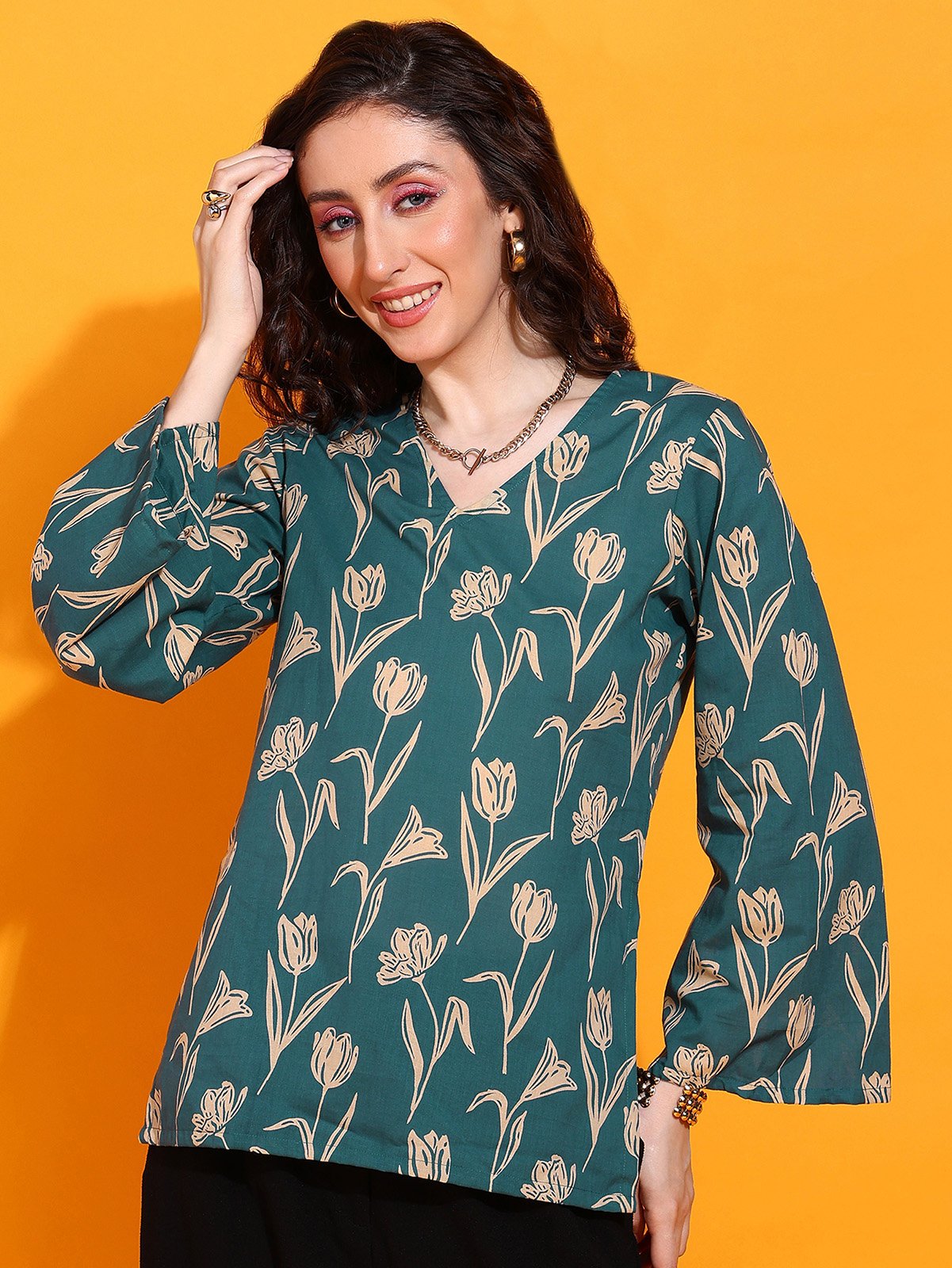 A chic floral Bell Sleev top designed for Gen Z girls who love comfort, charm, and a little chaos. Made for your college, café, or casual workdays — all in one fit.