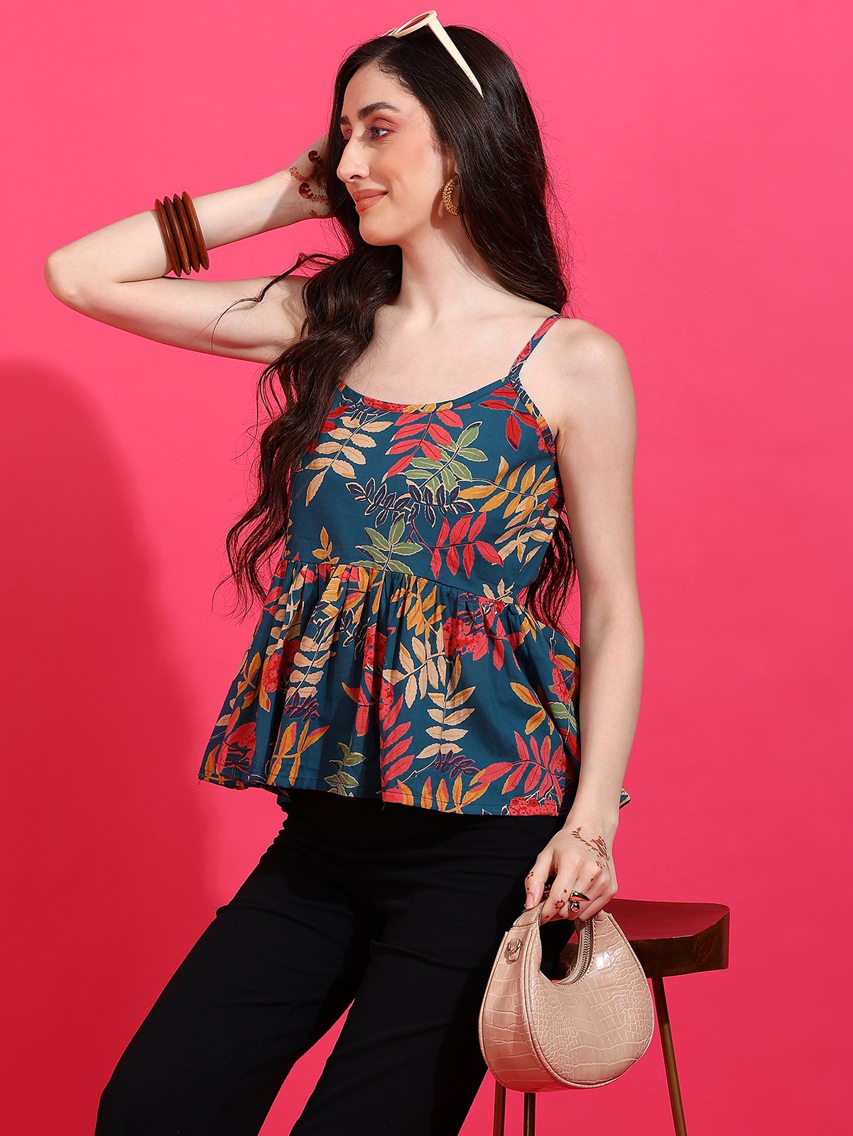 Step into the beauty of the forest with the Senyora Vanmohini Teal Multi-Color Leaf Print Gathered Peplum Top. This charming sleeveless top features a vibrant print of teal, red, orange, and green leaves on a deep teal base. The simple, elegant strappy neckline, cinched waist, and flowing gathered peplum hem create a flattering, feminine silhouette. Perfect for a resort holiday, brunch, or any stylish outing.