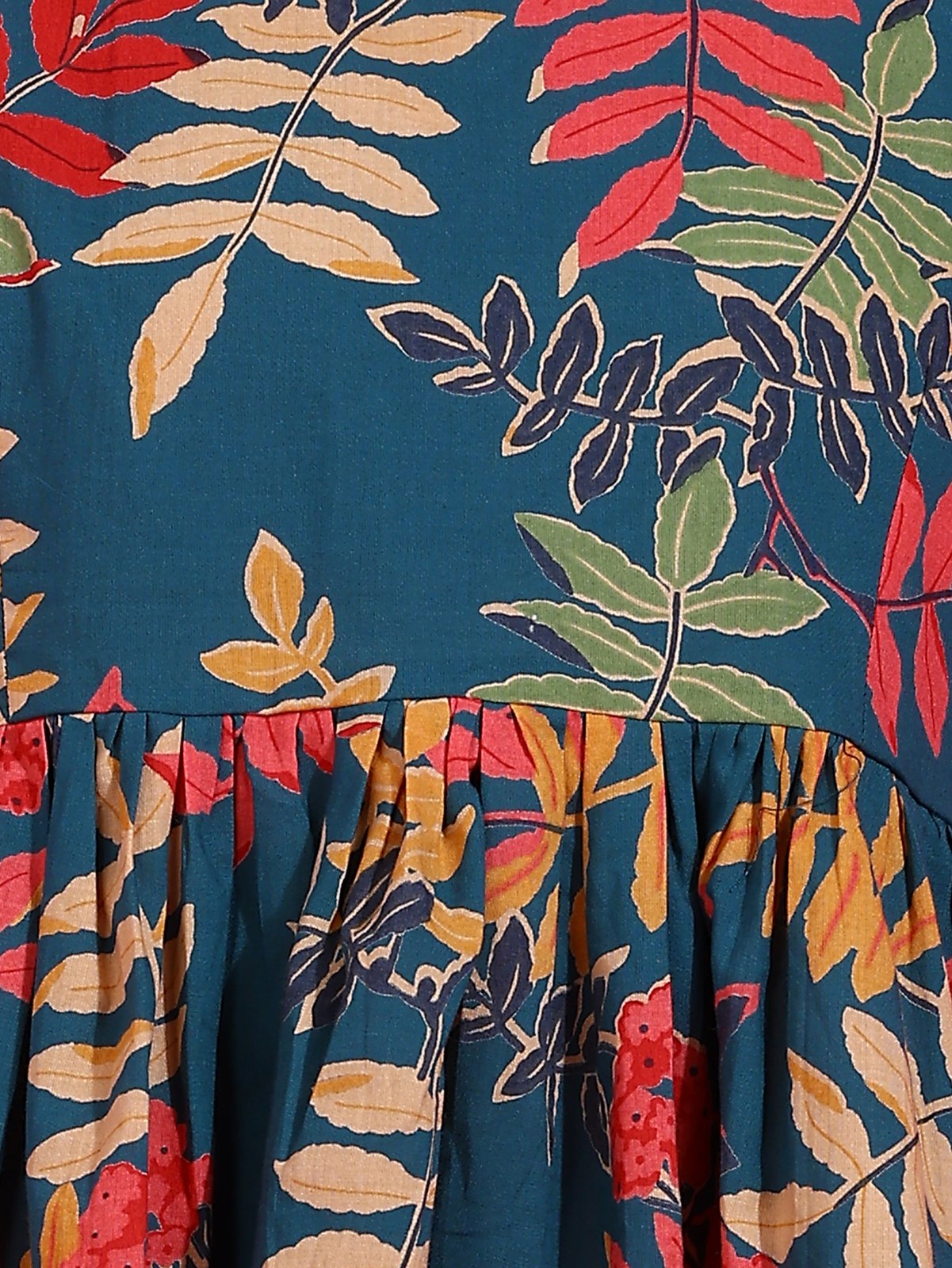 Vibrant Vanmohini Print: The top is covered in an intricate, dense leaf and foliage print in a bold palette of teal, red, and orange tones against a deep teal base. This pattern is inspired by a beautiful, flourishing forest.