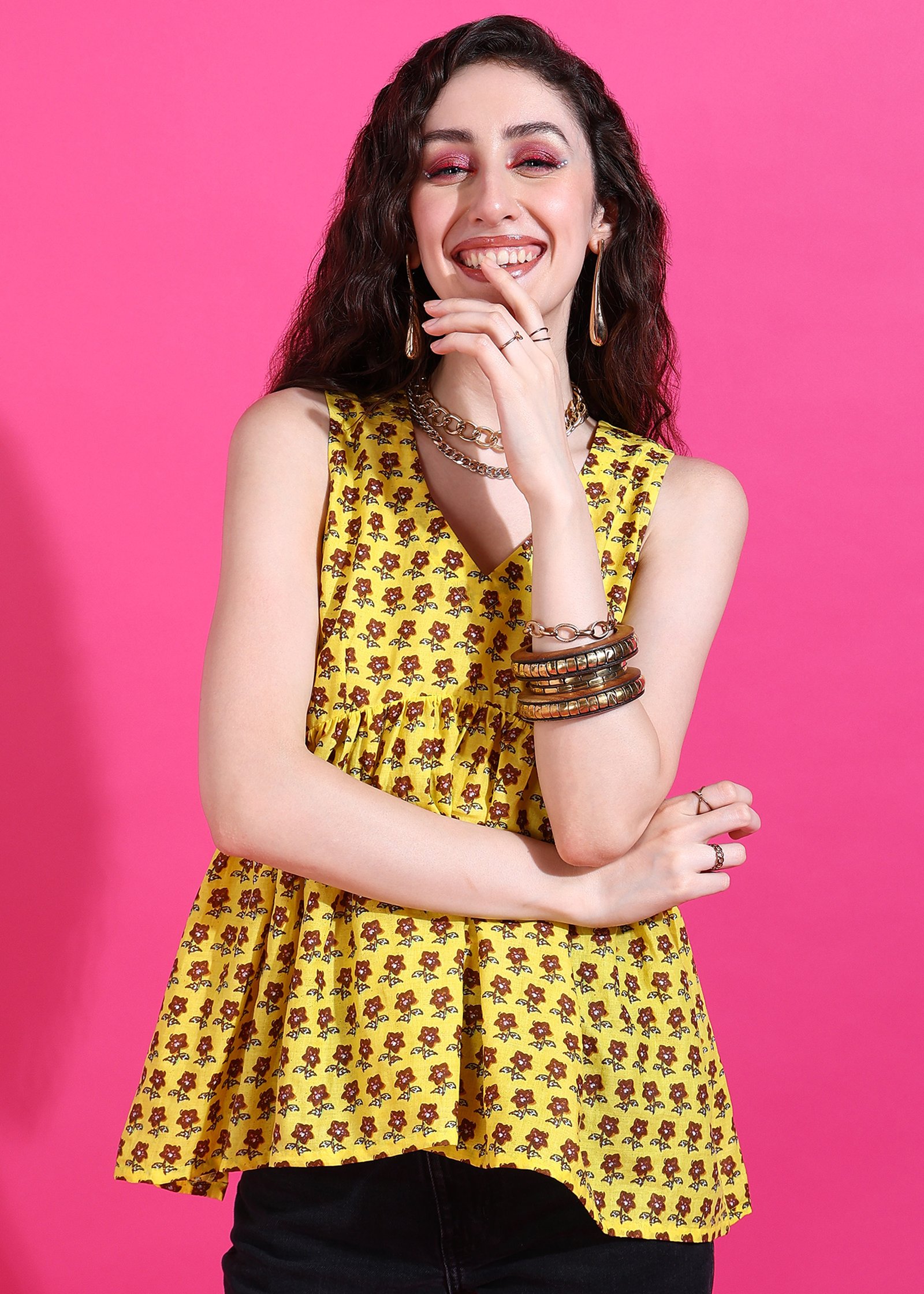 Add a feminine flair to your look with the Senyora Yellow Floral Print V-Neck Peplum Top. This charming sleeveless top features a vibrant yellow base with a delicate red-brown Genda Gul (Marigold) floral print. The flattering V-neckline and gracefully gathered peplum hem create a defined and stylish silhouette. Perfect for brightening up your casual, work, or festive wardrobe, this yellow floral peplum top pairs beautifully with high-waisted bottoms.