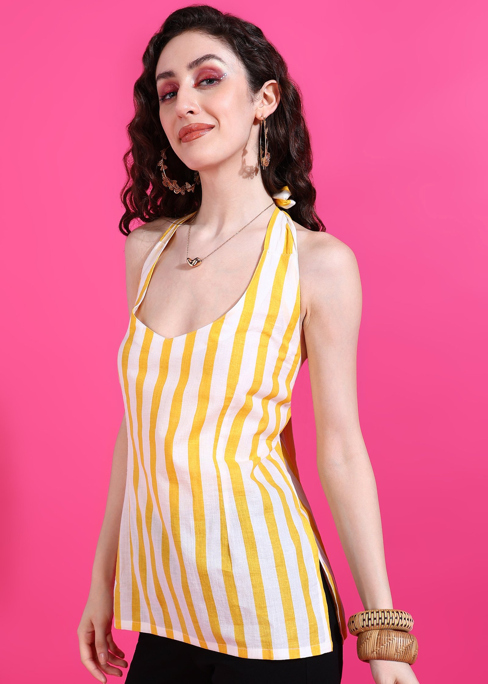 Shop the Senyora Yellow & White Striped Halter Neck Top today and shine wherever you go!