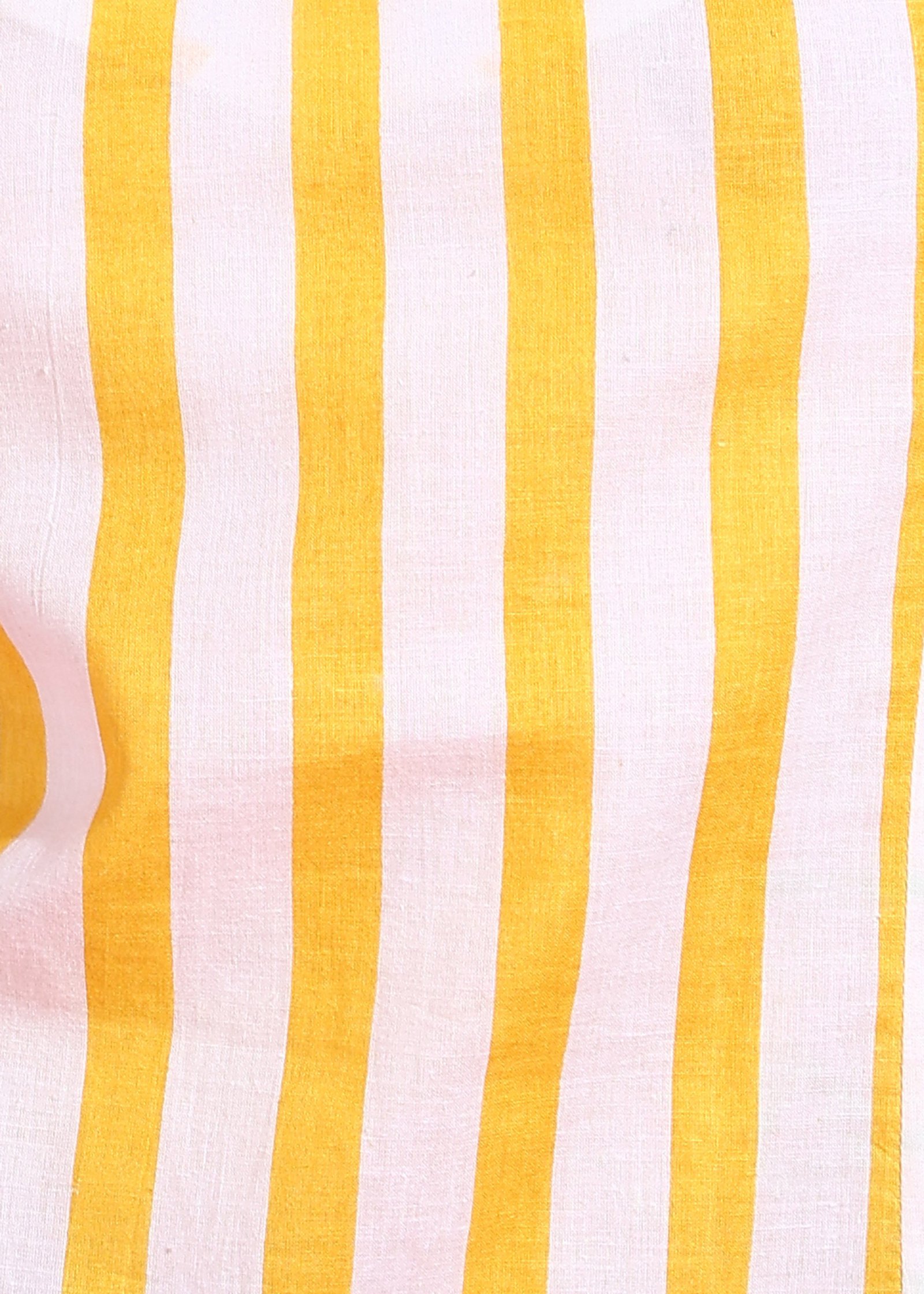 Sunny Stripe Print: The top features a cheerful and bright yellow and white vertical stripe pattern that is perfect for summer and holiday destinations, capturing a playful yet refined spirit.