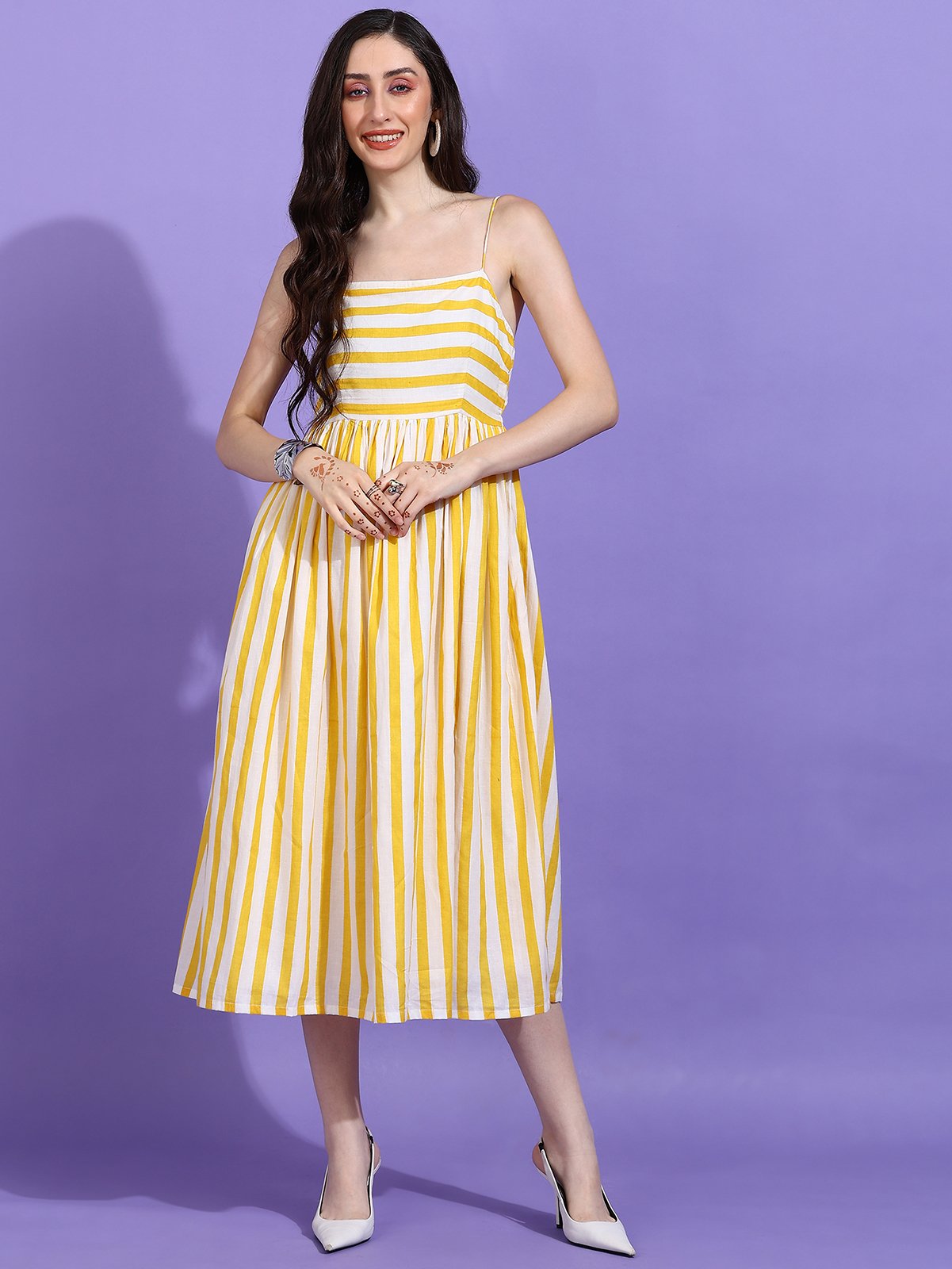 Step into the sunshine with the Senyora Yellow & White Striped Strappy Midi Dress. This breezy summer sundress features a vibrant yellow and white vertical stripe pattern, a flattering fitted bodice with thin shoulder straps, and a full, flowing skirt. Made from a comfortable cotton blend, this striped midi dress is perfect for brunches, vacations, or a stylish day out. Available in sizes XS to XXL.